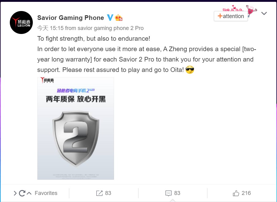 In a Weibo post, the Lenovo Legion mobile division has announced the above-mentioned warranty update for the Lenovo Legion Phone 2 Pro in China. As per the post, the device will get a two-year official warranty from the company itself.