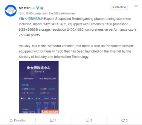 Now, the Master Lu Weibo post shows a screenshot of the benchmarks of a Redmi device with model number M2104K10AC. The device in testing has a MediaTek Dimensity 1100 chipset, 8GB of RAM, 256GB storage, and an FHD+ display.