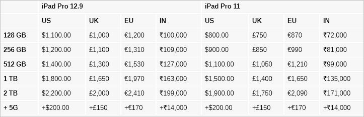 As for the pricing, the iPad Pro 12.9 starts at $1,099 for the 4G version and $1,299 for the 5G version. On the other hand, the 11-inch model starts at $799 while the WiFi+cellular version will retail for $999.