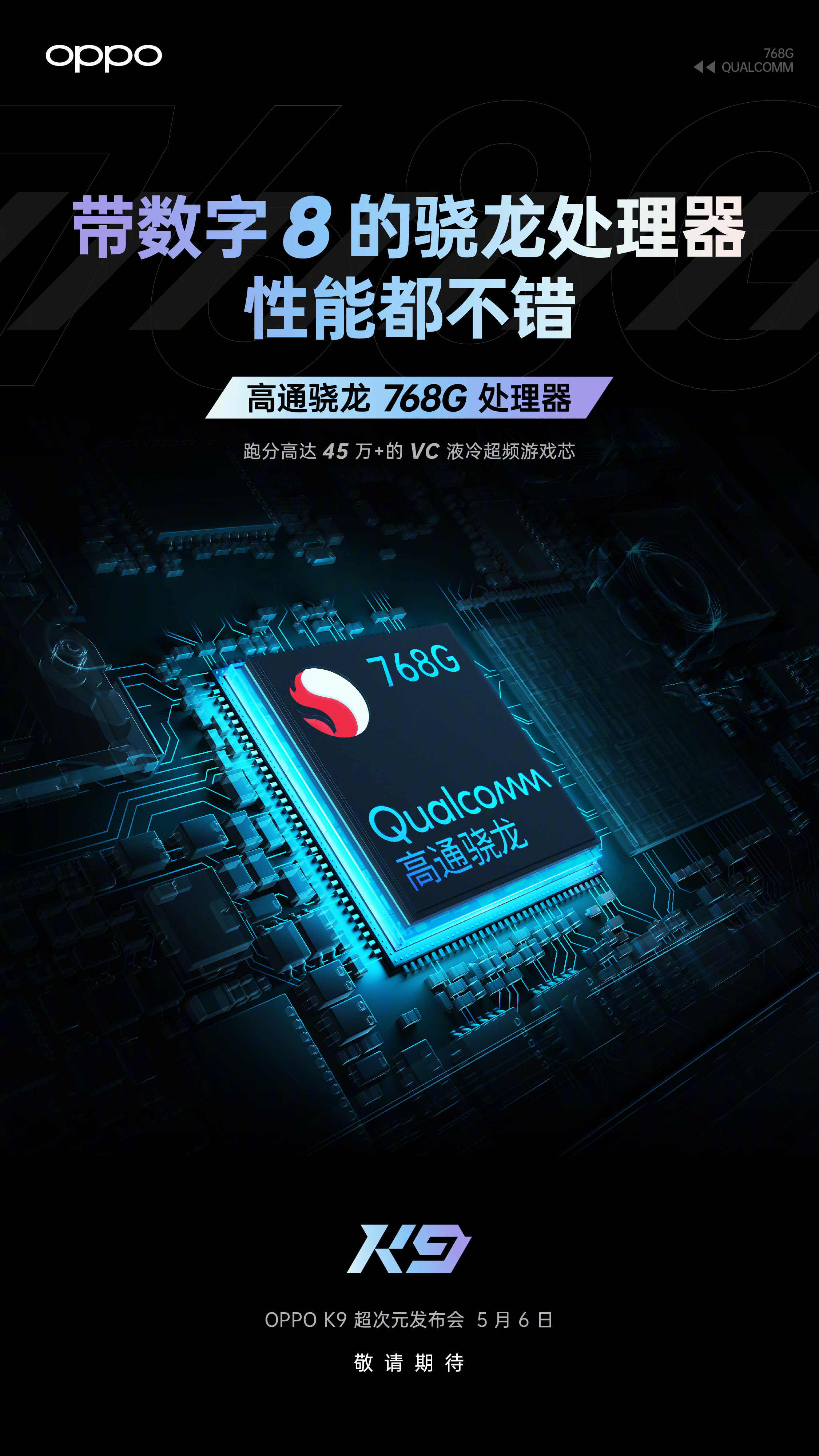 The Snapdragon 768G, which fuels the OPPO K9 5G delivers peak clocking speeds of 2.8GHz. This SoC is an overclocked version of the Snapdragon 765G. The company has also confirmed that the K9 will be arriving with 3D liquid cooling technology.