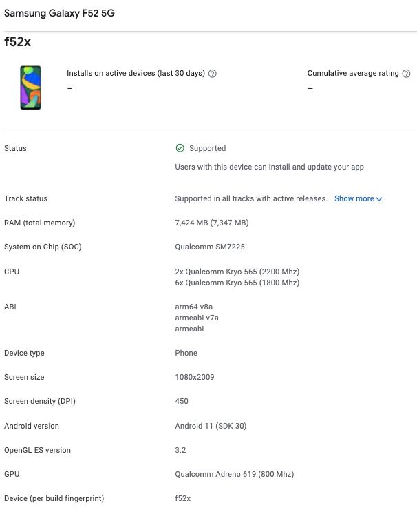 The Play Console states that the Galaxy F52 5G offers specs like Full HD+ resolution, 450ppi pixel density, Snapdragon 750G (mentioned as SM7225), 8 GB of RAM, and Android 11 OS.