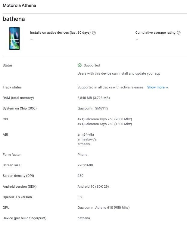 As for the expected specifications of the Motorola Defy (Athena), the Google Play Console listing shows that the smartphone will be powered by a Qualcomm Snapdragon 662 processor paired with 4GB of RAM. The phone will also run on Android 10 OS and will have a screen with HD+ resolution. The Play Console listing gave us a view of the front screen showing a waterdrop notch on top of the screen. The way the back cover wraps around the screen to create tightly sealed edges also suggests it may equally come with waterproof and dustproof properties. Recall that the original Motorola Defy was water-resistant and dustproof.