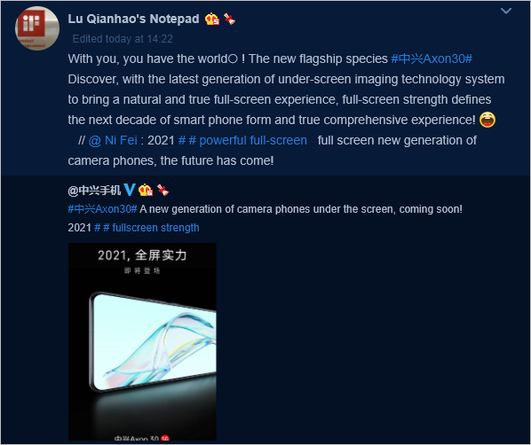 Apart from the imminent launch that the poster suggests, it also contains a render of the device, giving us a clue of what to expect. The teaser poster confirms that the Axon 30 series will feature a full-screen design without any notch or hole punch. In other words, the device will indeed feature ZTE’s next-gen under-screen camera technology. The selfie camera is under the display, giving the device an almost 100% screen-to-body ratio.