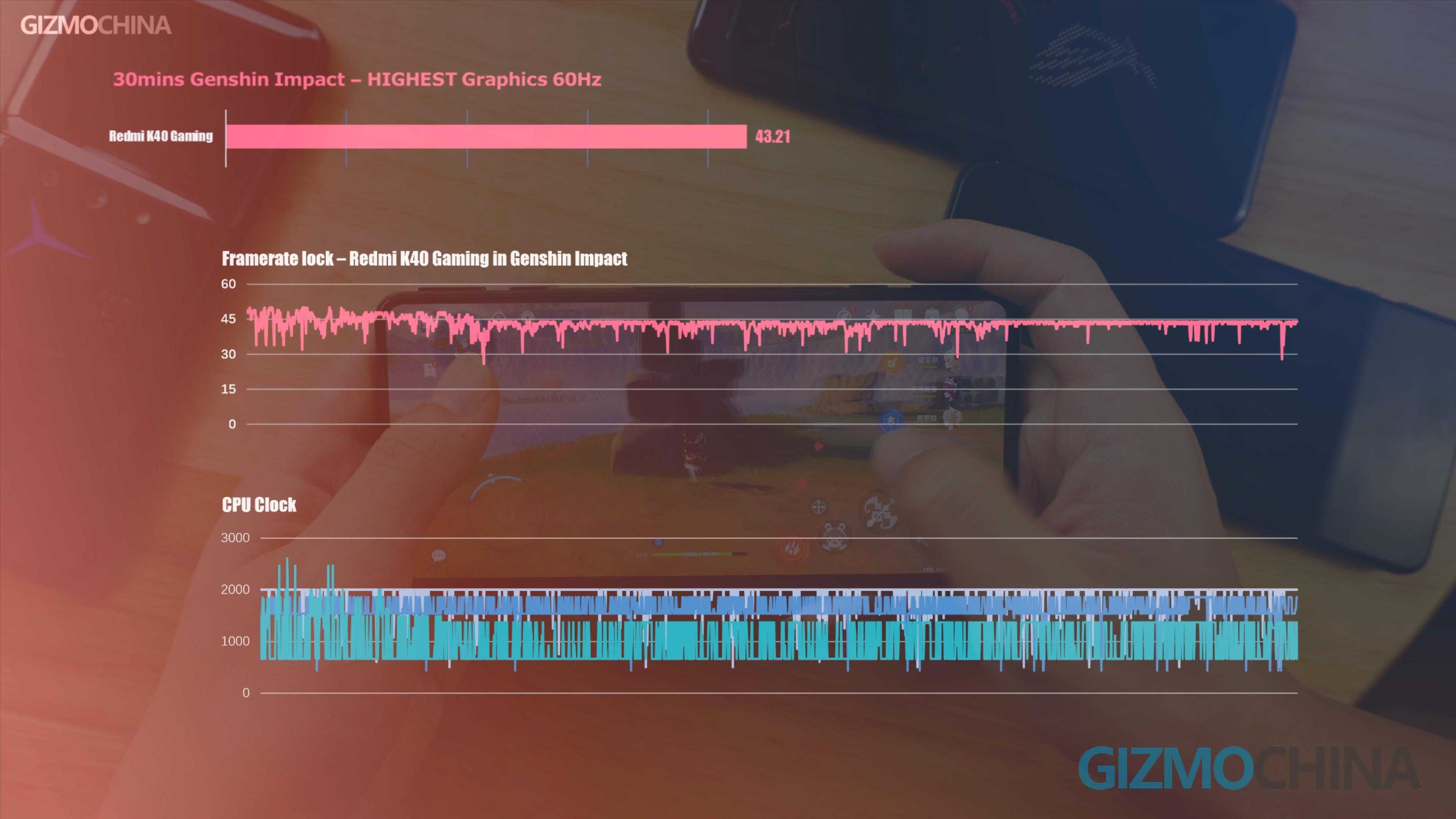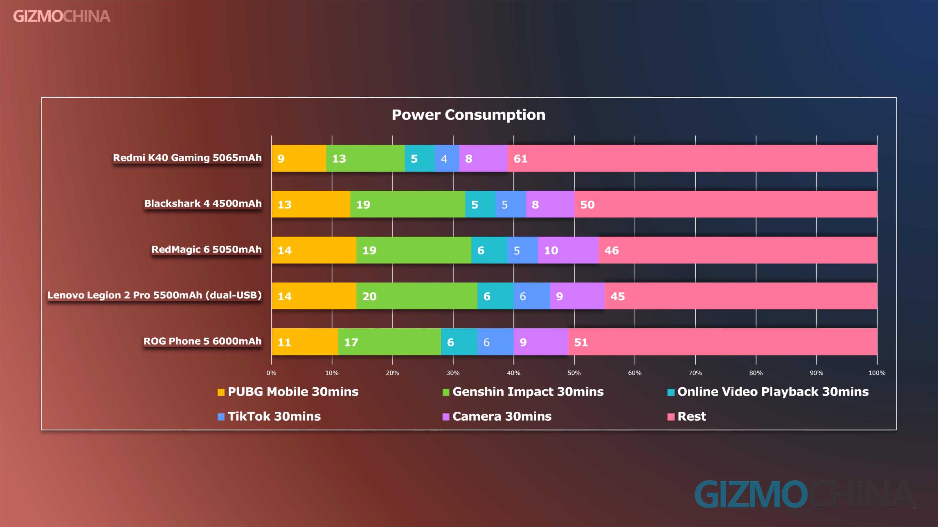 In Genshin Impact, it’s unsurprising that the Redmi K40 Gaming with locking framerate achieved the best results in heating control and power consumption. And the Blackshark 4 results are slightly better than the other three models. Although the three 888 models applied excellent thermal designs to maintain high performance output, the heating issue still existed. Well thanks to the three-part internal design, actually the ROG Phone and the Legion phone didn’t feel so hot when we were holding it during gameplay.