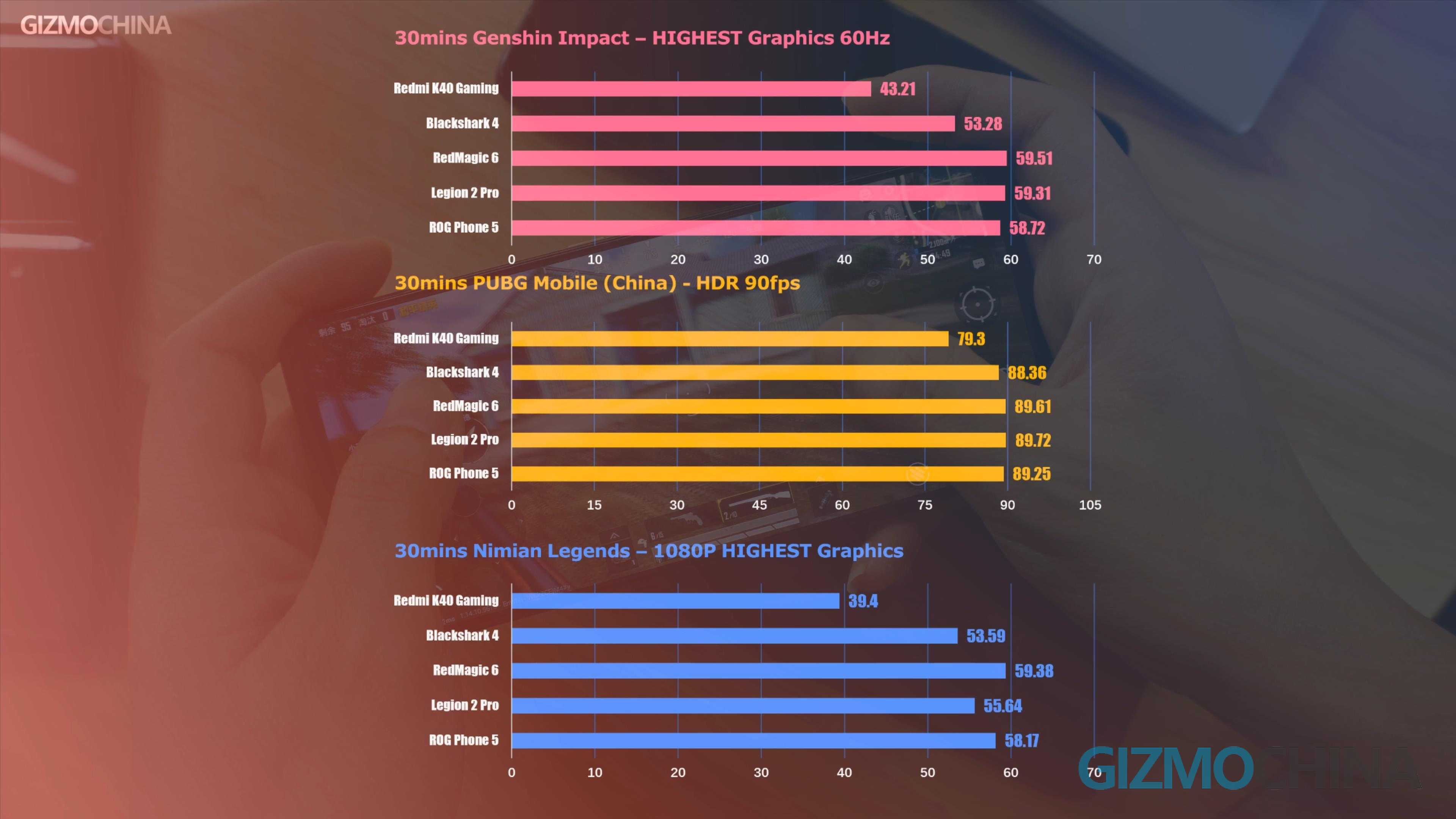 In our actual gaming test, from the framerate results, we cannot exactly pinpoint which model powered by the 888 chipset won the competition. They all achieved almost the best frame rate results in the three games. In PUBG mobile, the best result were achieved by the Legion phone, while in Nimian legends and Genshin Impact, the Redmagic 6 won. If I have to pick up the model that has the most stable performance, we will give the title to the Redmagic 6. However, the biggest surprise is the Blackshark 4 powered by the 870 chipset, which didn’t lag much behind, while in the last place, unsurprisingly, was the Redmi K40 Gaming edition. However, what really disappointed us was the Redmi model’s performance in Genshin Impact. It’s ridiculous for a gaming phone to lock the framerate to 50fps in a popular game, and even throttle down at 45fps. But in our early review video of the Redmi K40 gaming model, you could find that the phone at that time didn’t lock the framerate in its early software version. But now considering its high power consumption and thermal issue, Redmi eventually used a more conservative CPU strategy in the latest update.