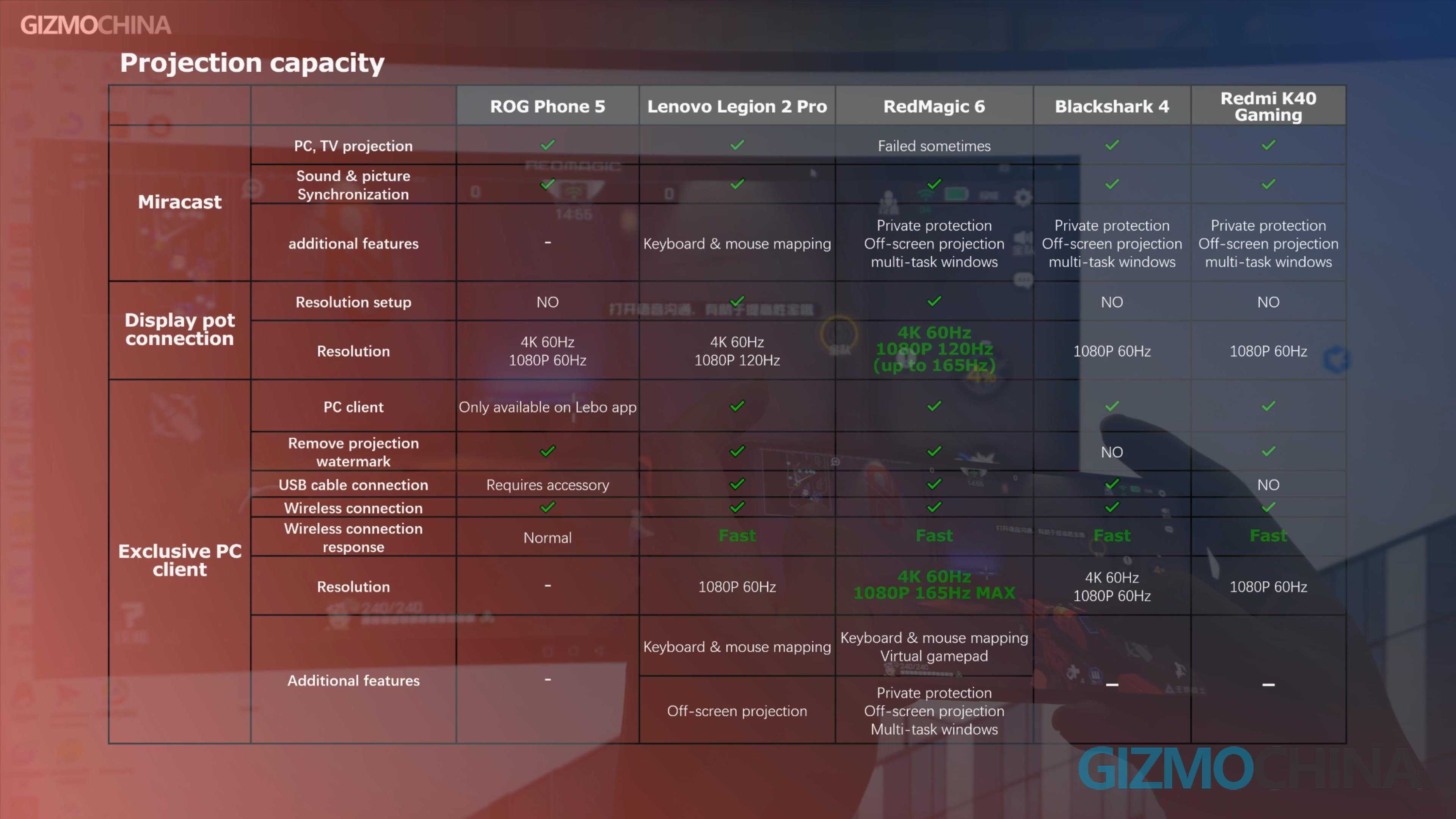 For more details, you can just check the table here. But please note that the Redmi K40 Gaming edition didn’t really optimize its projection capacity. Over game-related software, it really is no different from a regular phone.