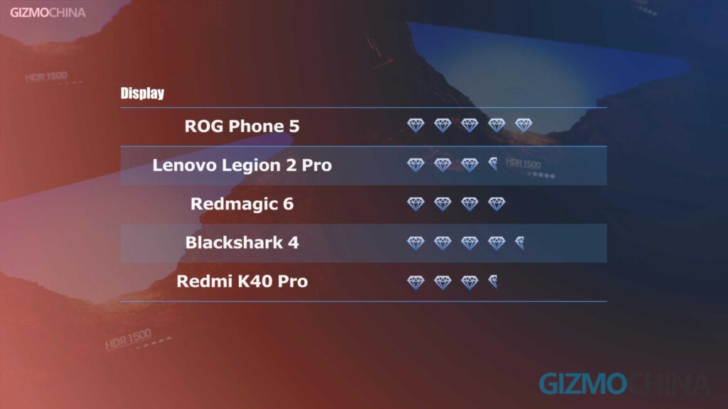 So for display rating, we’d like to give the ROG model 5 points out of 5, 4.5 for the Blackshark 4, 4 for the Redmagic 6, and 3.5 for both the Redmi model and the Legion Phone.