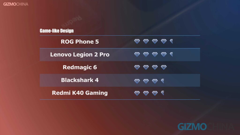 So in this department, we’d like to give 1 point to the Redmi model, 3 points to the Blackshark 4, 4 points to the ROG phone and the Legion Phone respectively, and 5 points to the RedMagic 6.