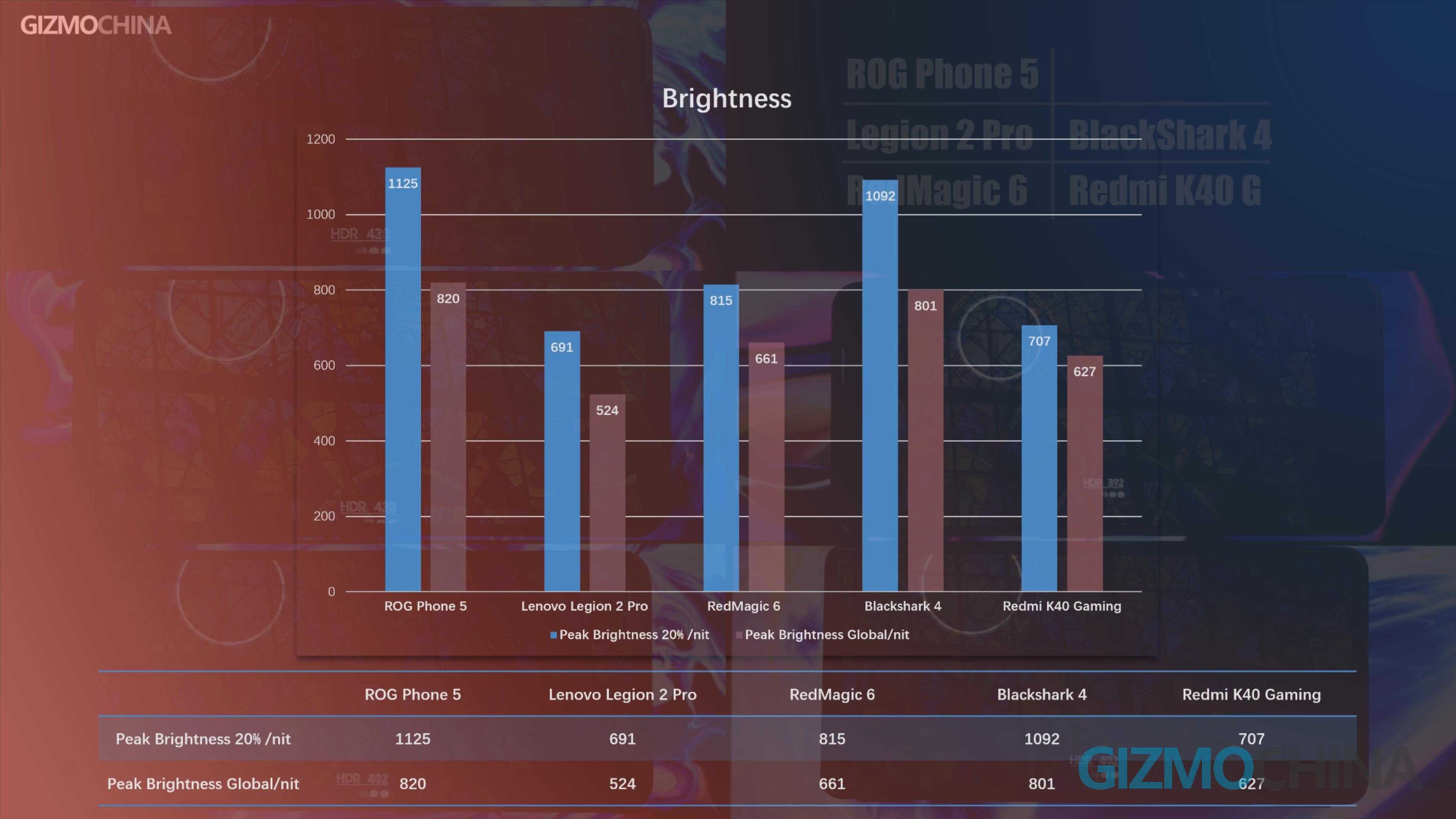All these 5 models claim their panels support HDR content, and especially the ROG Phone, the Legion model and the Blackshark 4 claim they can breach the 1000-nit barrier upwards to fit the HDR standard. But in our test, only the Blackshark 4 and the ROG phone could actually reach around 800nits of peak brightness at APL-100 and over 1000 nits at APL1, while the Legion model failed to deliver on its promise and only got a close result to the Redmi K40 Gaming edition. But when we used them for HDR1000 content playback, the Blackshark 4 turned out to be the best one to activate the highest brightness.