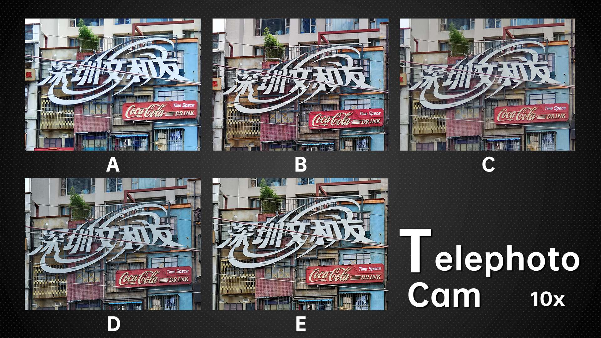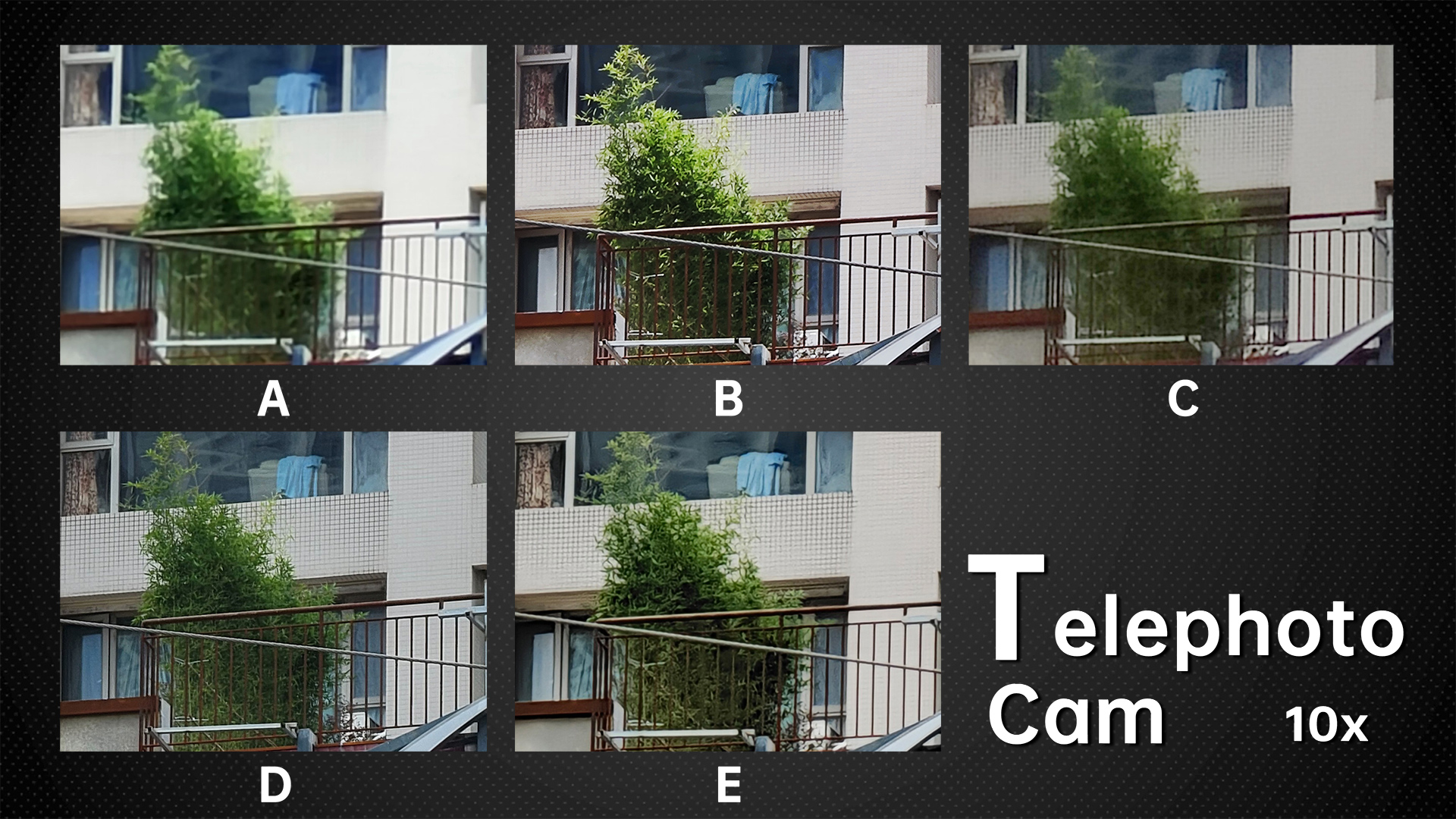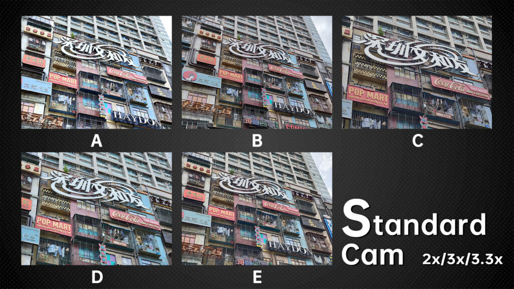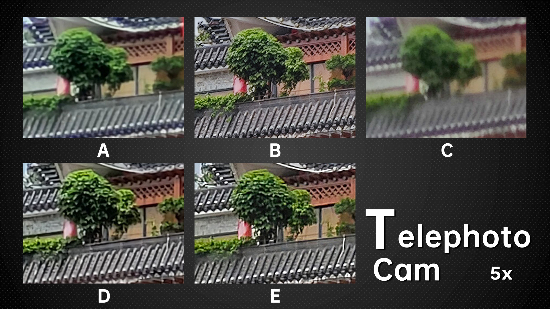 Because D has 10x optical zoom, we review the 5x and 10x together. The small samples may not be visible in the above image, but the difference in the original picture is still obvious. You can see that B has the most details, followed by E. D is slightly weaker than E, but the remaining two are too blurry, especially the C.