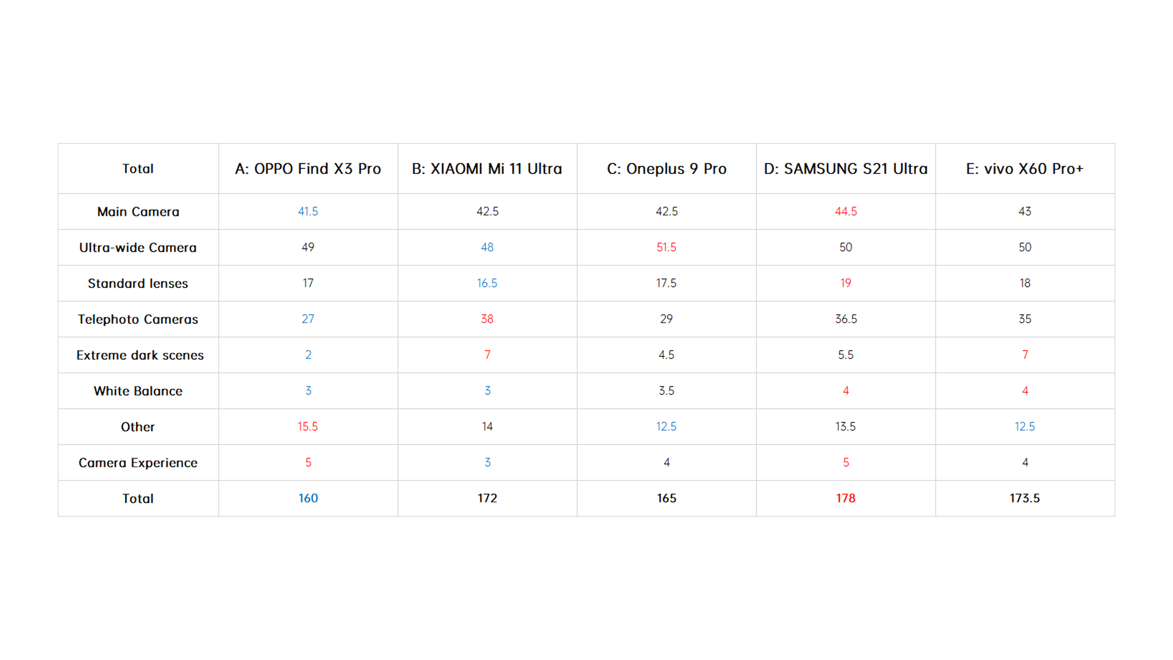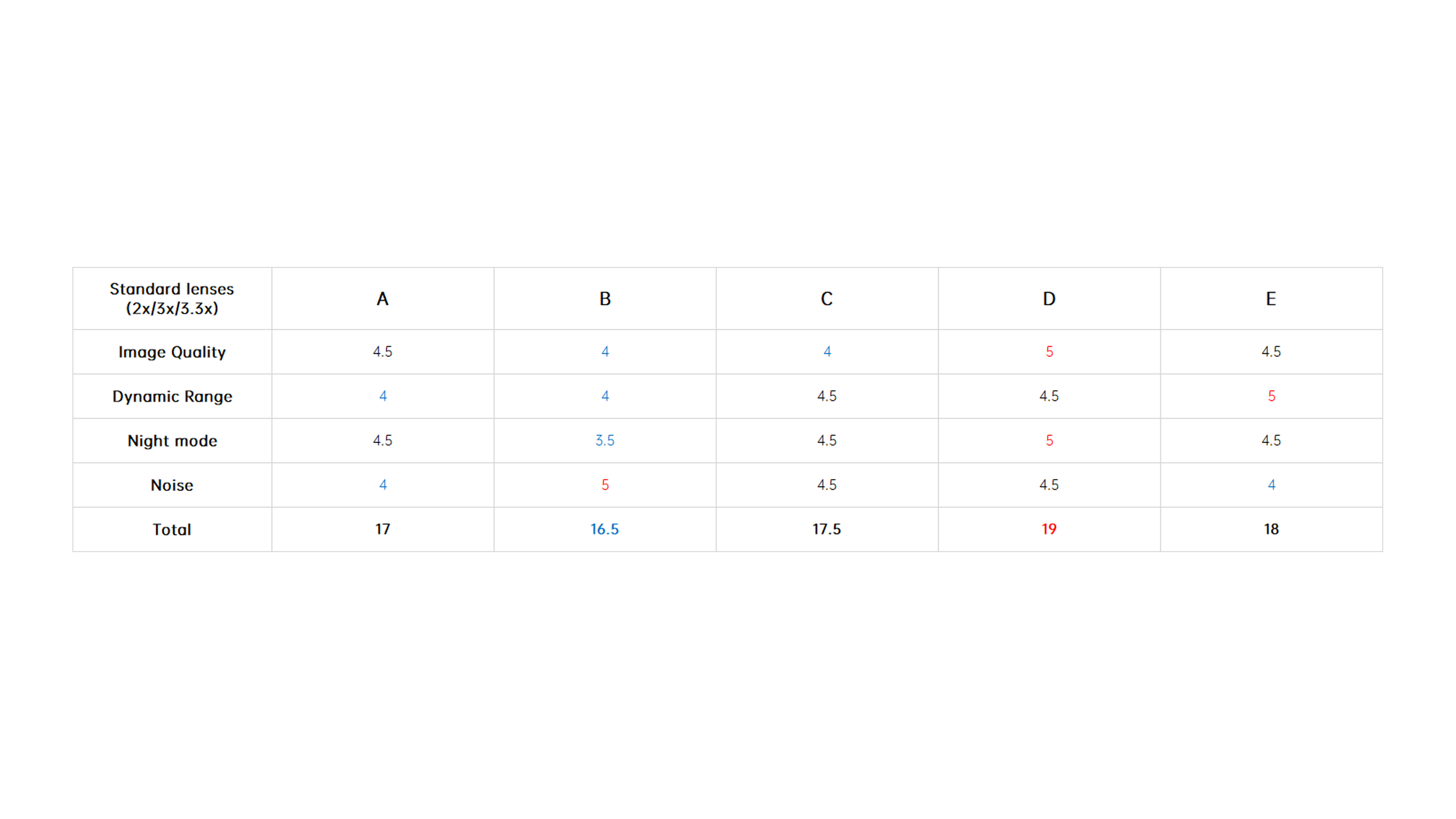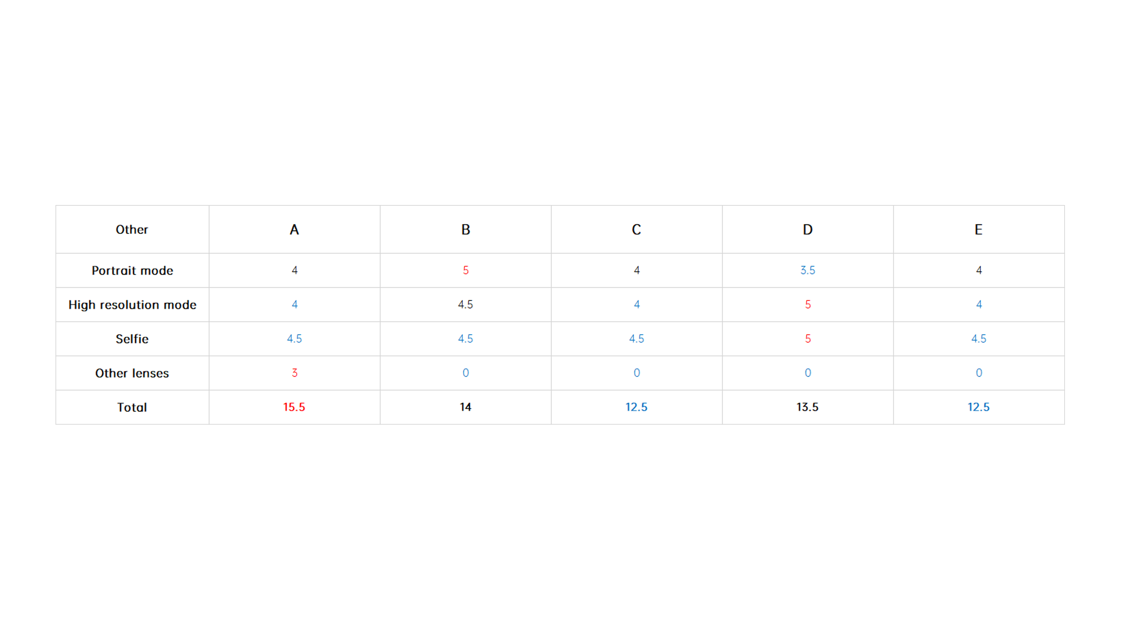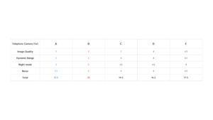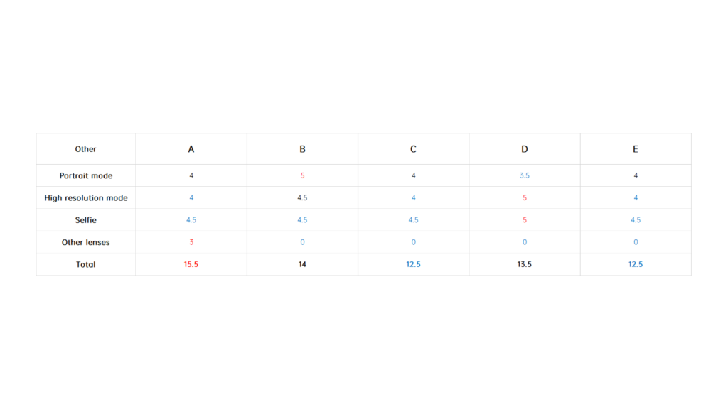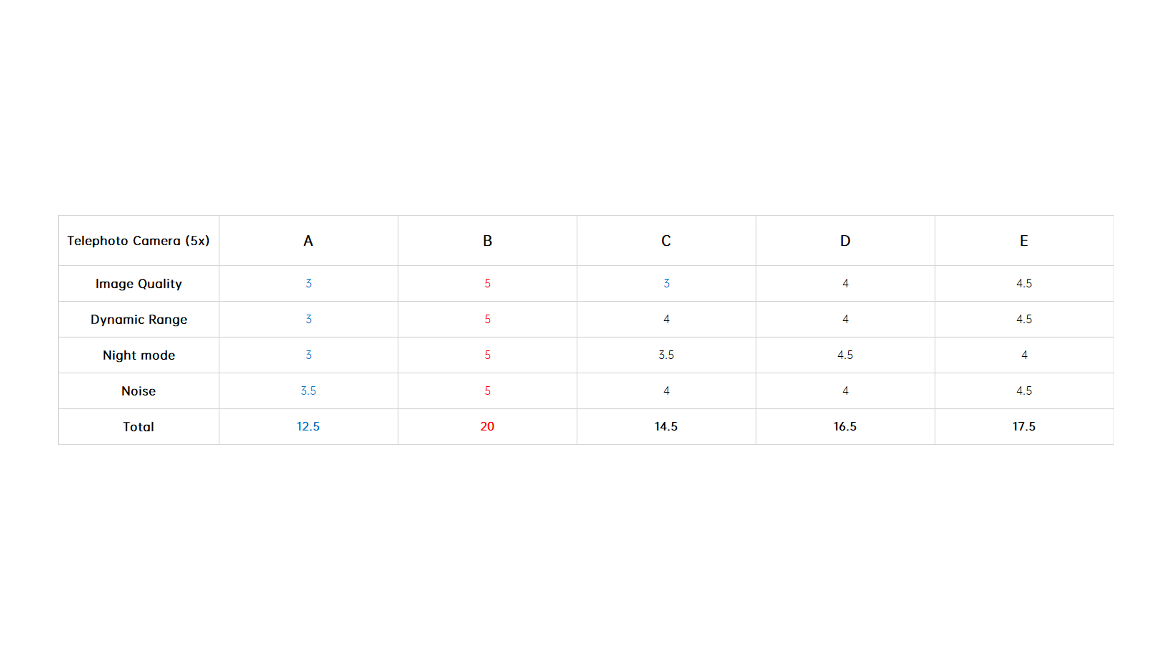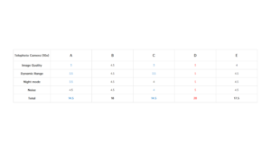 The final scores are shown below, with the 5x telephoto and 10x telephoto winners being taken by B and D with perfect scores in each category, respectively.