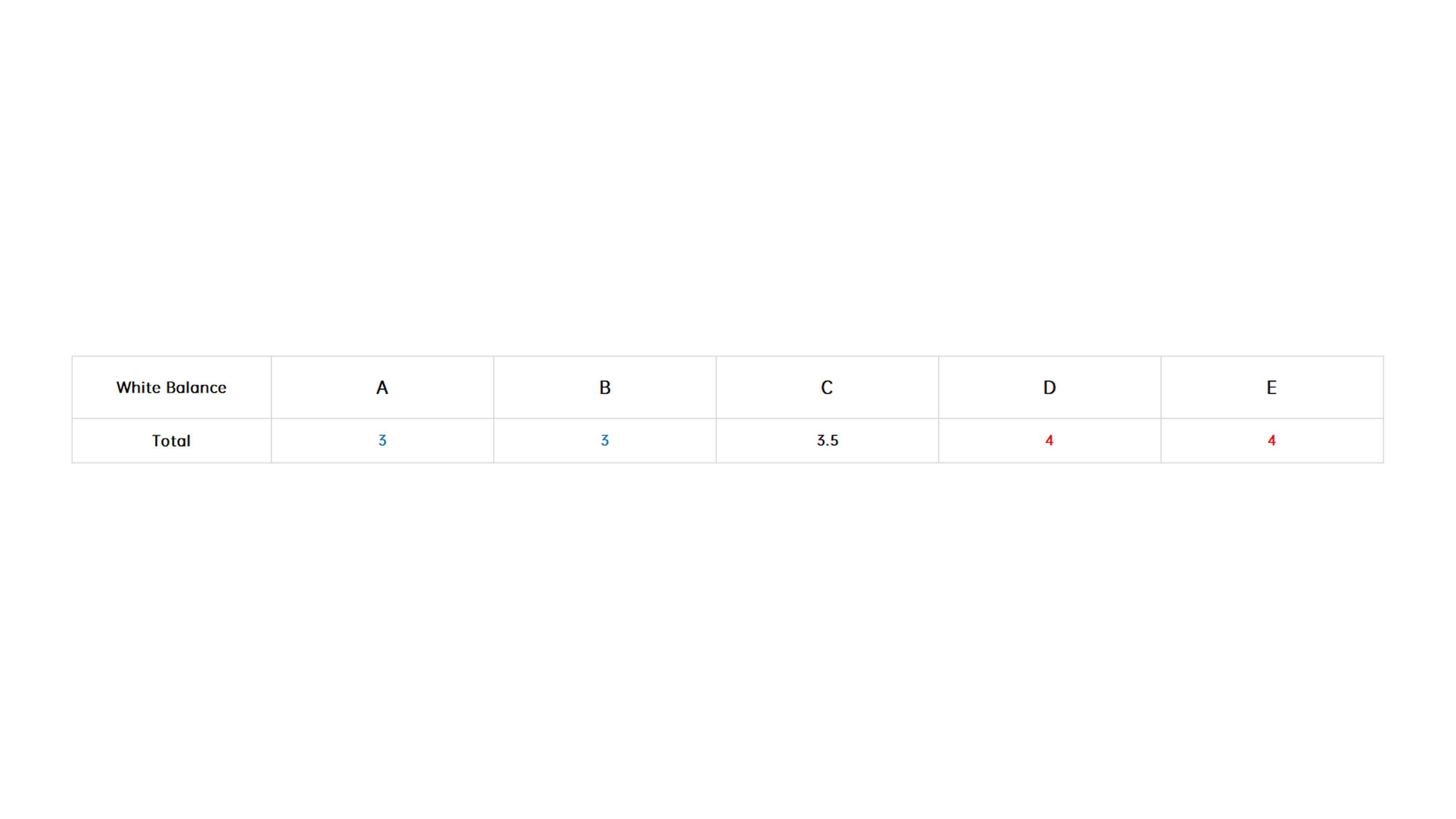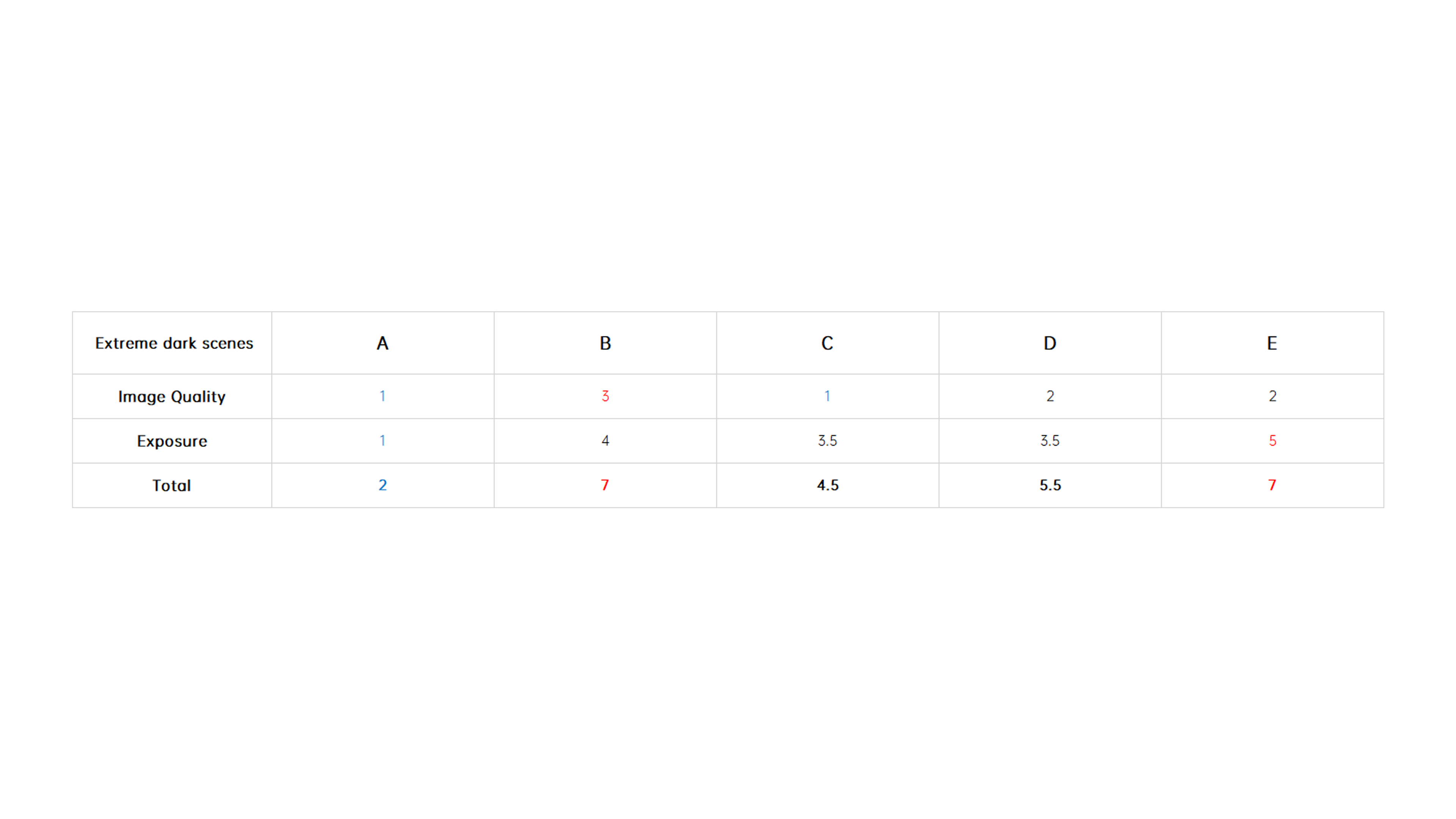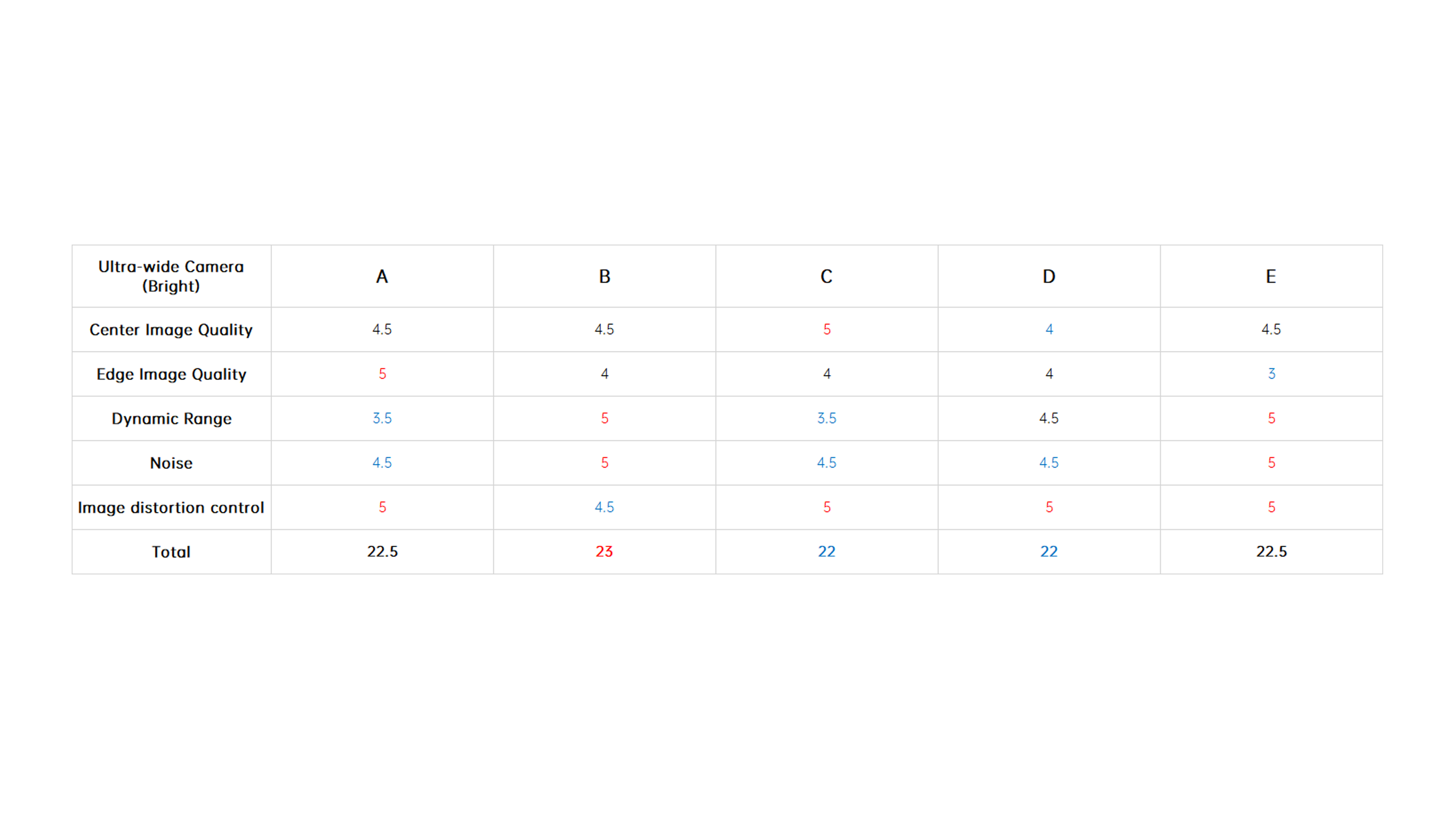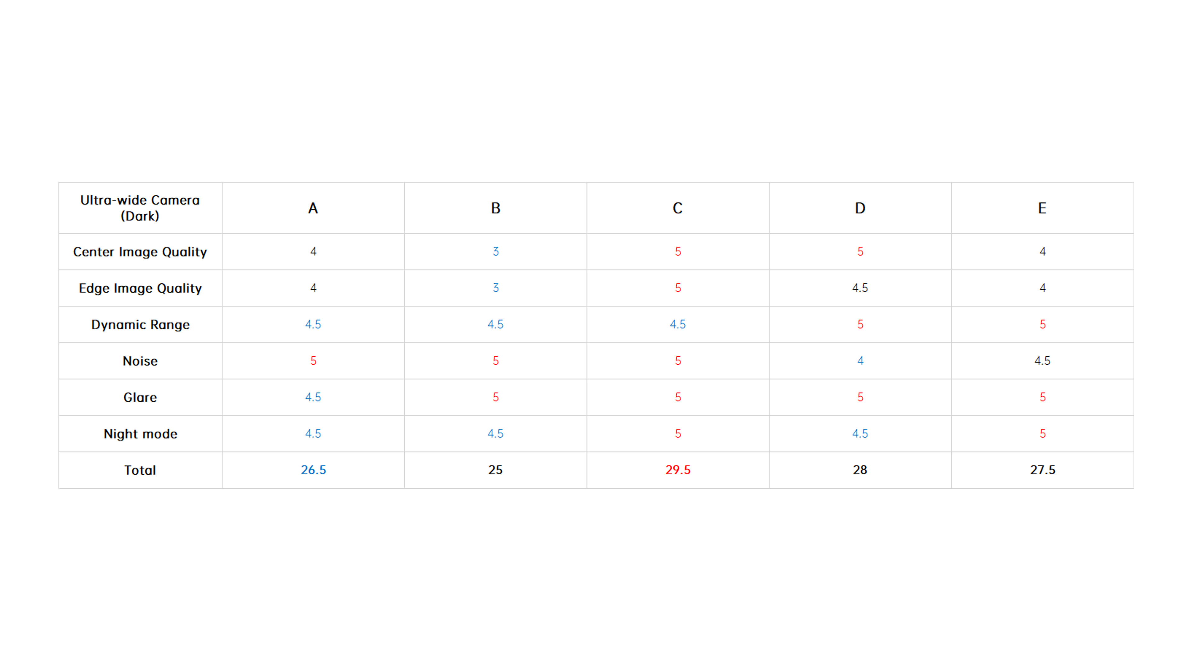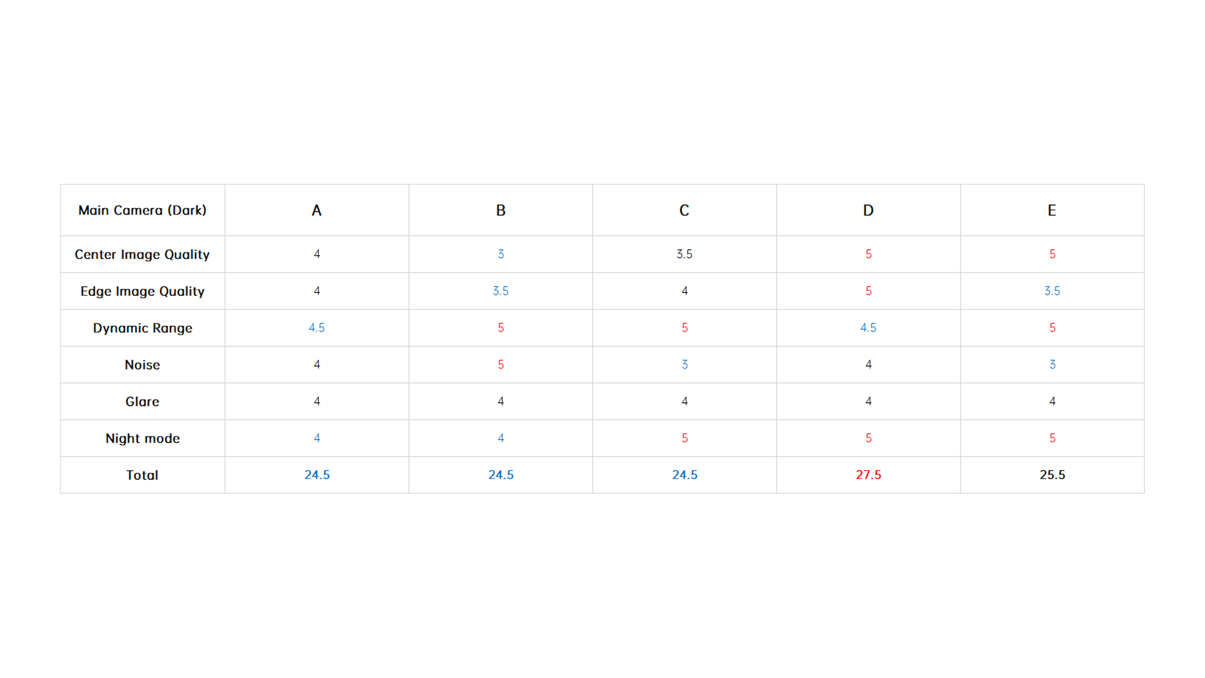 The final scores are shown below, with the 5x telephoto and 10x telephoto winners being taken by B and D with perfect scores in each category, respectively.