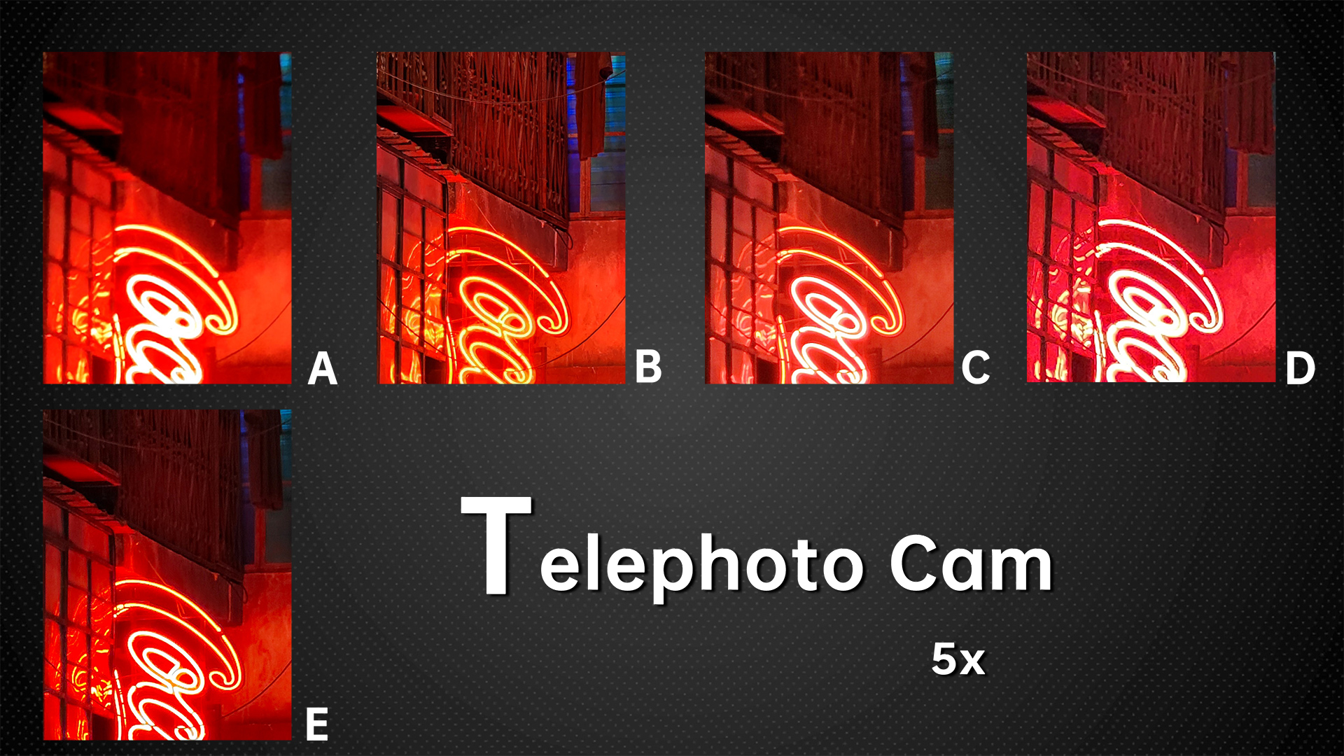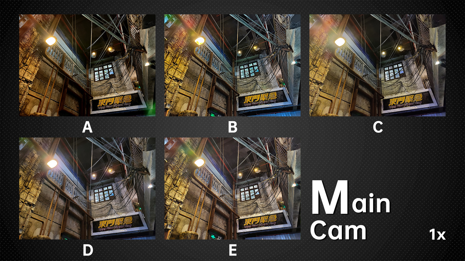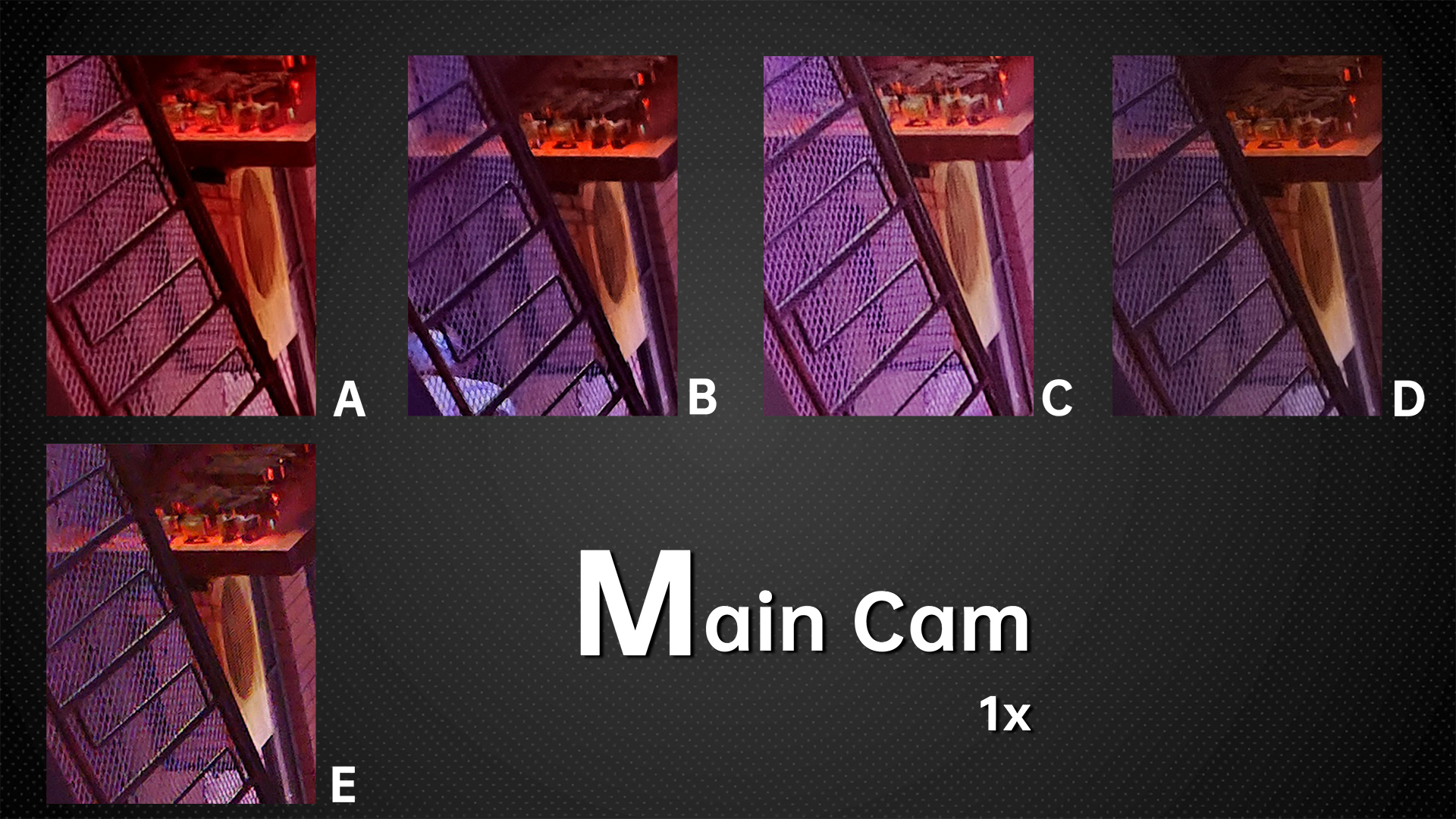 And from this indoor sample of complex lighting, let’s check the image quality at the edges. D leads the pack, with clear lines of wire mesh. A and C have clearer lines, and C has the strongest sharpening of the five. E has false colors, and the B model has blurred images, performing significantly worse than the first three phones. The dynamic range of all five phones is similar, while A captured underexposed images in the dark and D overexposed the samples in the upper right corner of the light sign, so we deducted some points from both these models, but we couldn’t find any other fault. This picture tests the noise control and glare control of the phone.