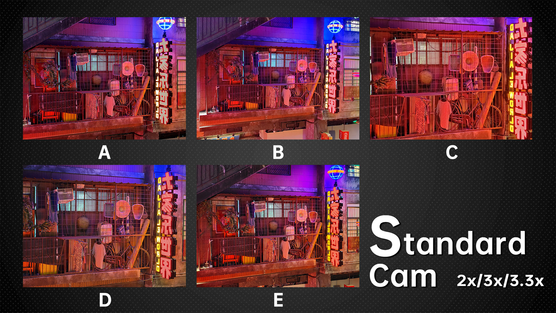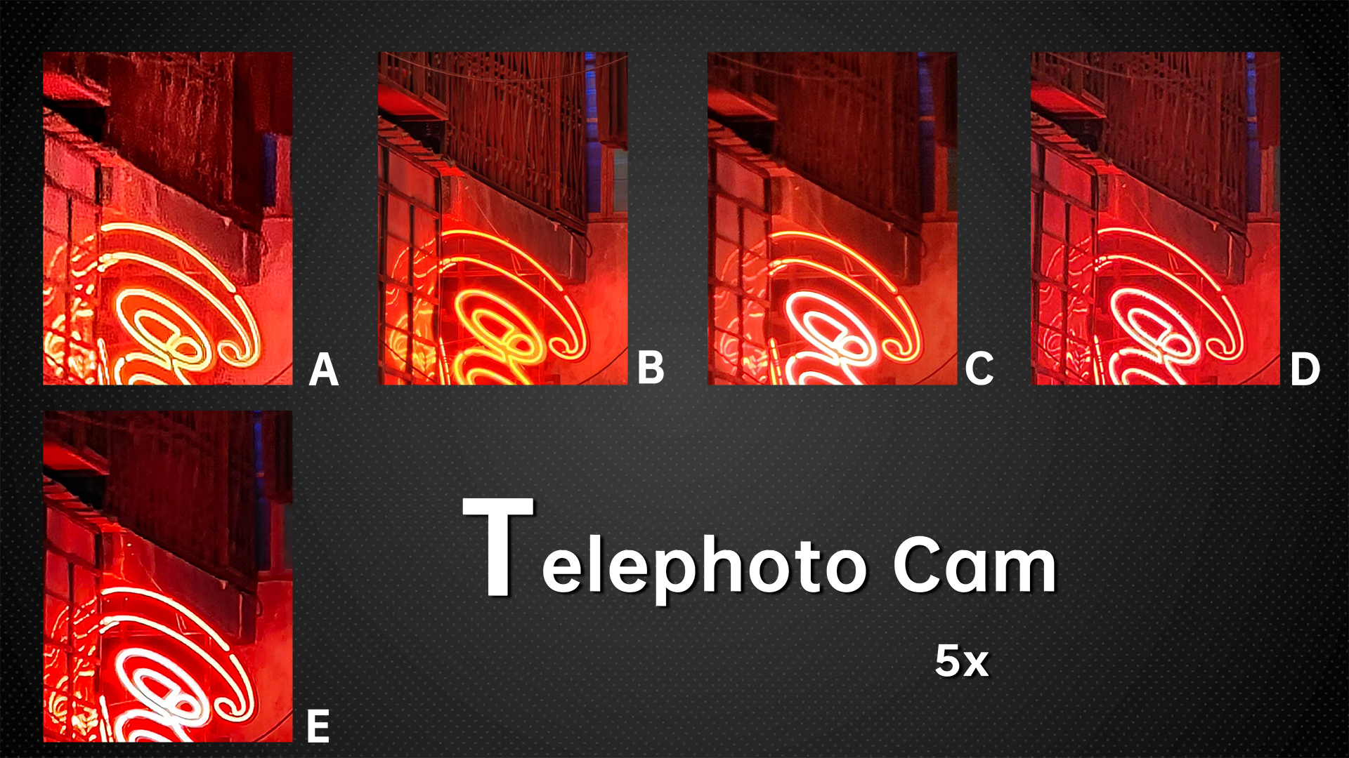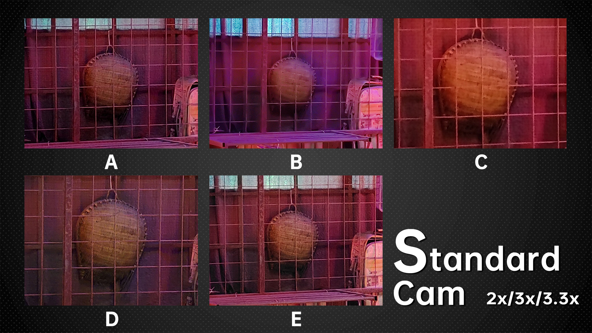 And from this indoor sample of complex lighting, let’s check the image quality at the edges. D leads the pack, with clear lines of wire mesh. A and C have clearer lines, and C has the strongest sharpening of the five. E has false colors, and the B model has blurred images, performing significantly worse than the first three phones. The dynamic range of all five phones is similar, while A captured underexposed images in the dark and D overexposed the samples in the upper right corner of the light sign, so we deducted some points from both these models, but we couldn’t find any other fault. This picture tests the noise control and glare control of the phone.