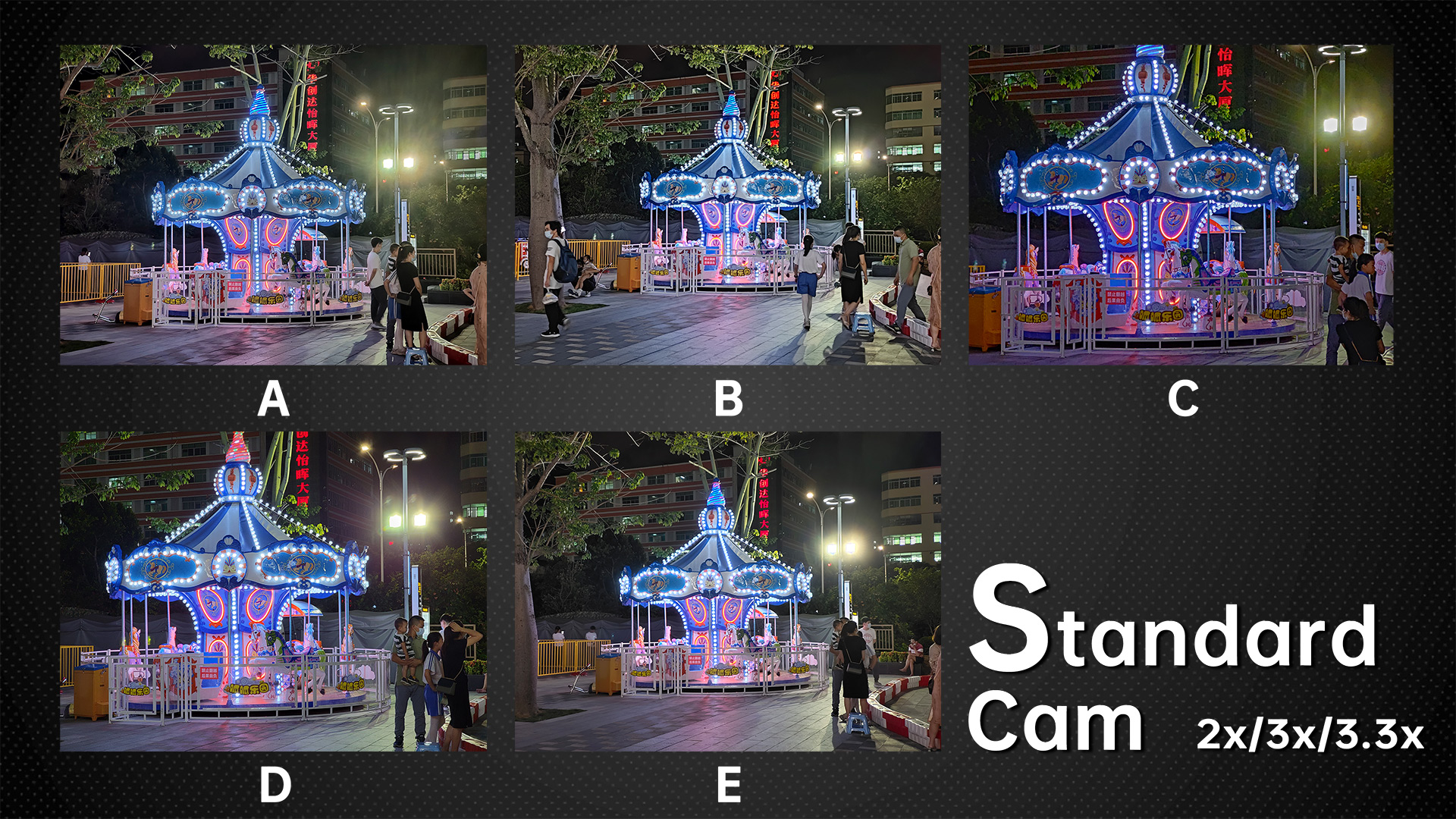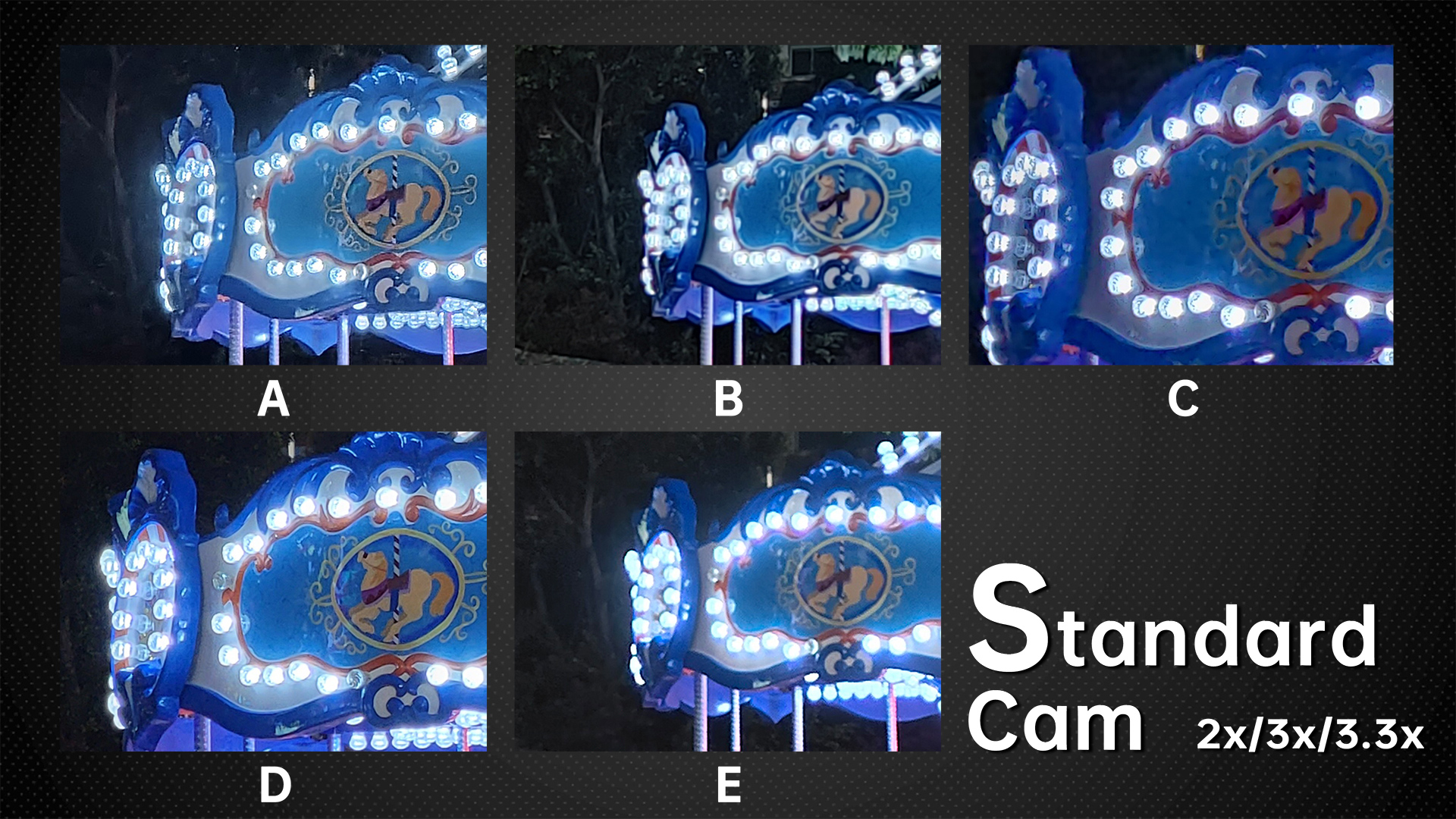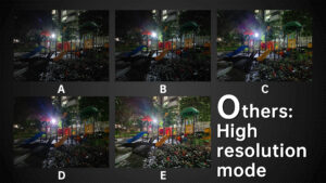 The night mode improves low light scenes and should be used very often. Fortunately, the night mode is very well tuned on each of the five models. A is still not as detailed in the dark as the other four, and its sharpening in the night mode is the worst among the five phones. B‘s highlights are not controlled and the details are the least.