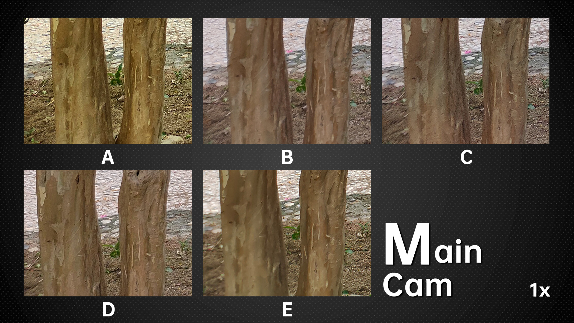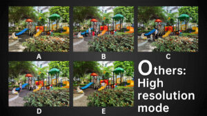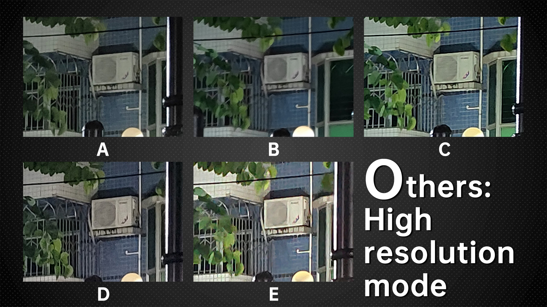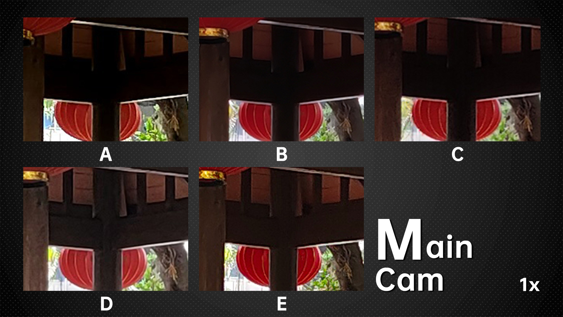 Now Let’s zoom in to see the picture quality. D is undoubtedly the best, followed by E and A. Lastly, let’s check out B and C. B also has the least noise due to the powerful noise reduction. The noisiest ones are A and E.