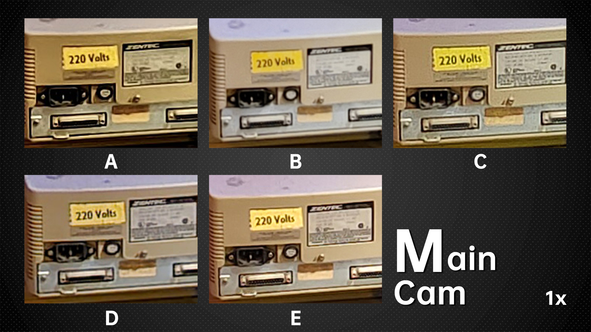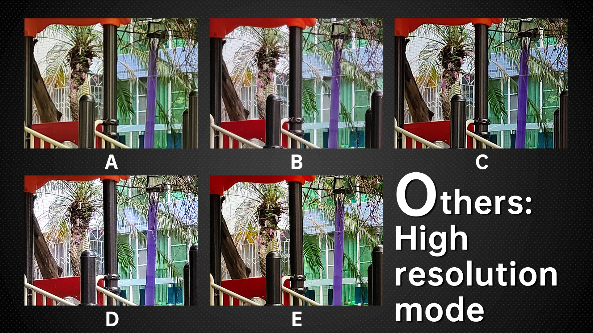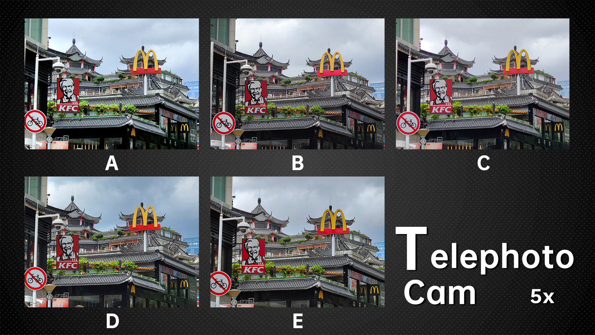 Now Let’s zoom in to see the picture quality. D is undoubtedly the best, followed by E and A. Lastly, let’s check out B and C. B also has the least noise due to the powerful noise reduction. The noisiest ones are A and E.
