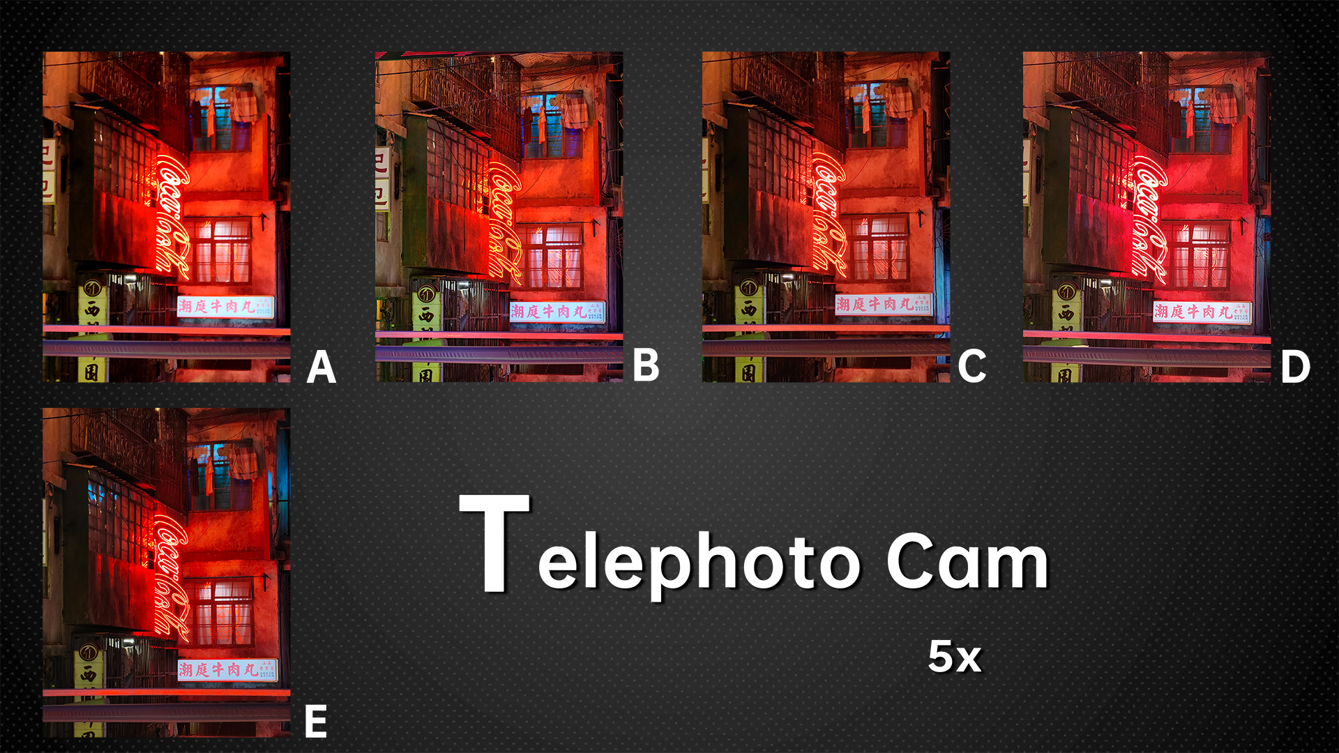 Let’s change the scene and see how each brand performs in situations with high contrast between light and dark. It is easy to see from the Coca-Cola logo and ceiling that E has the best control of highlights and the sample from D has the most detail in the dark. The other phones also have excellent dynamic range performance and excellent glare control. A has a little more glare than the other phones, but it doesn’t affect much, so 0.5 points are deducted. From this scene with complex light sources, the five phones don’t look much different with night mode on. B is still the same as in the auto mode, with poor image quality at the center. A still has obvious signs of sharpening. D’s night mode is a little blurry. C and E performed relatively well.