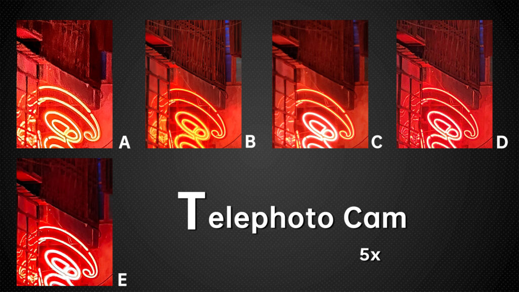 The night mode of E seems to have regressed compared to the auto mode, the image has become blurred, and we’ll explain why this happened in the camera experience session later. Of course, C still doesn’t support night mode for telephoto. D outperformed B in the 10x photos, and the rest of the conclusions are almost identical to the 5x photos, so I won’t repeat them.