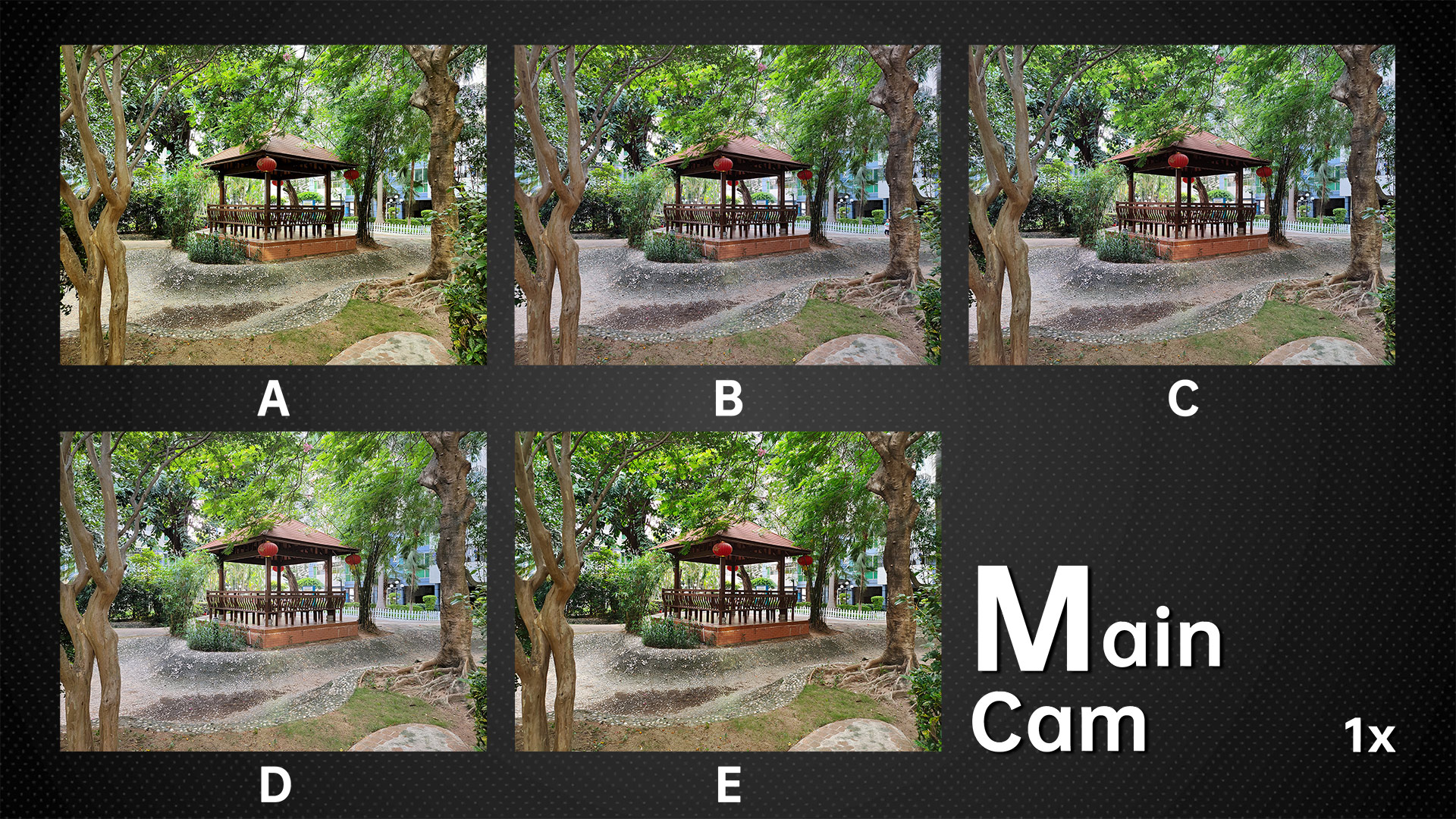 Since these five phones have different standard lens focal lengths, we chose their respective focal lengths for comparison, with B using a 2x zoom on the main camera.