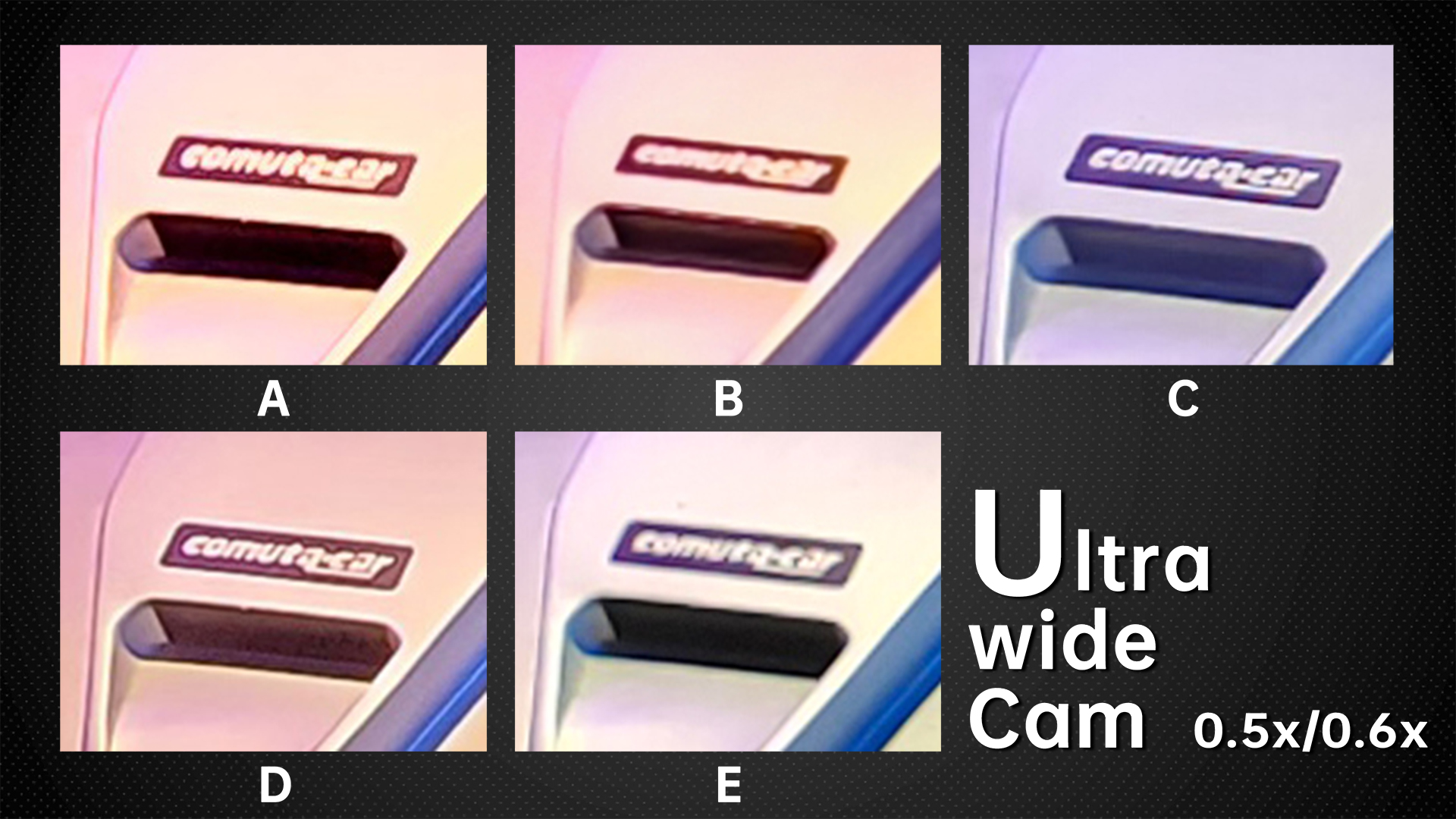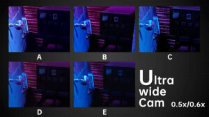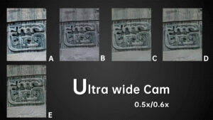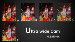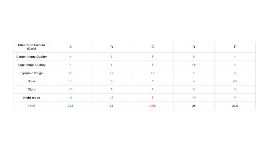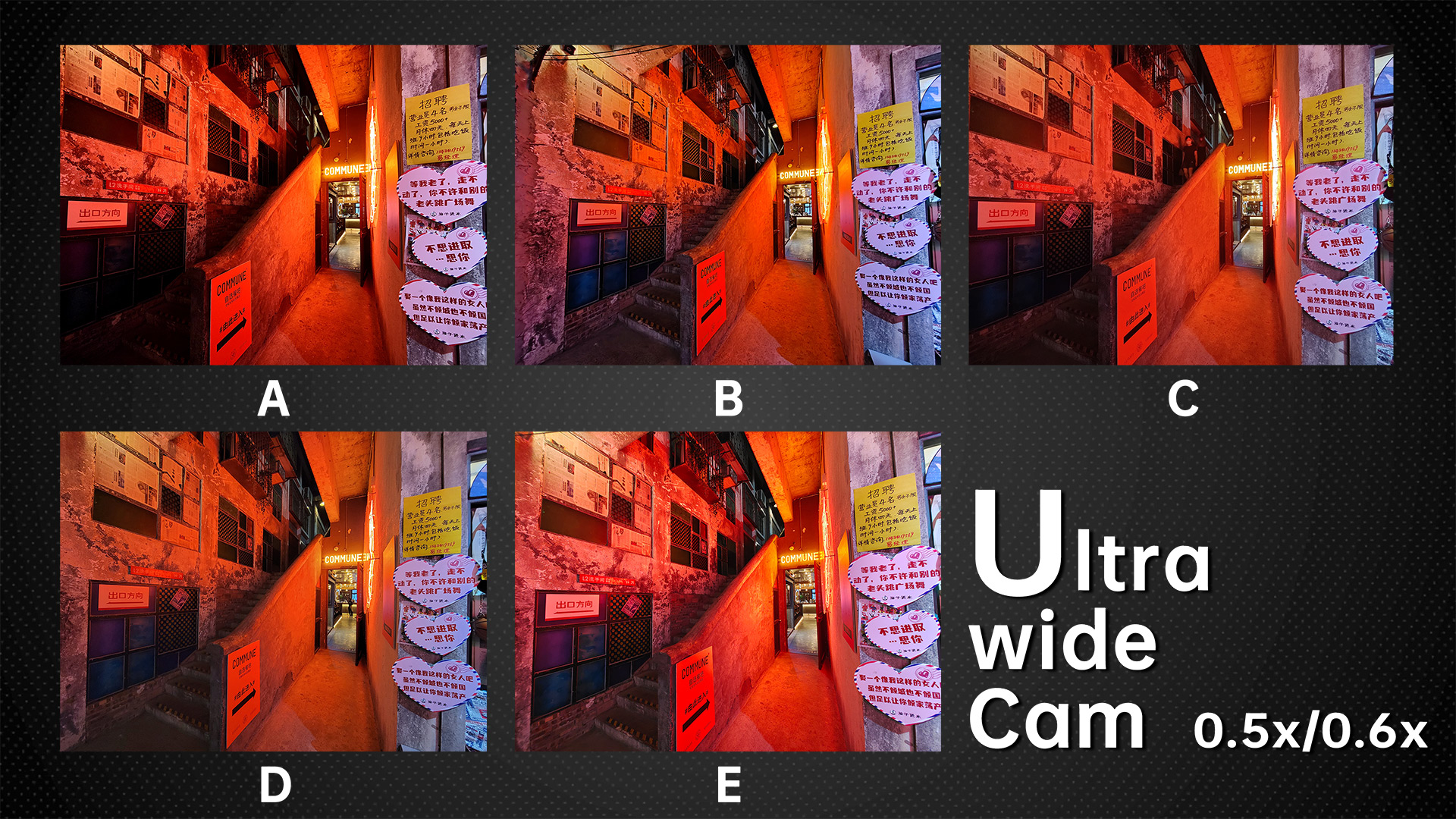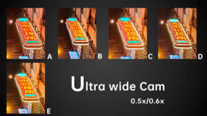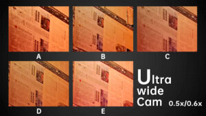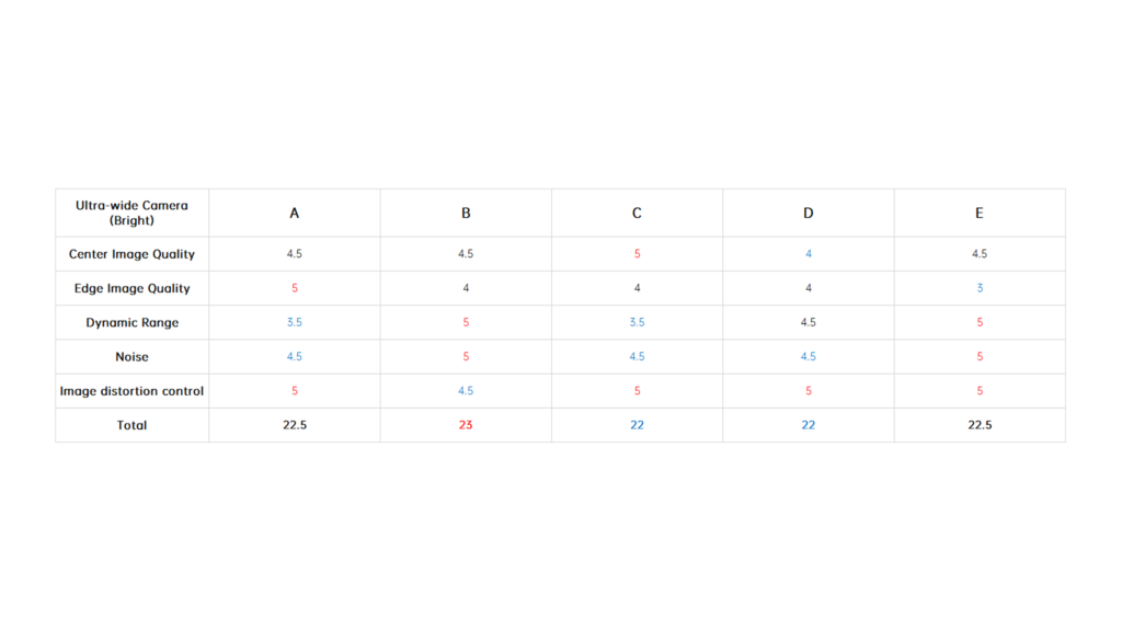 Under dim indoor light, the ultra wide angle cameras with average sensors are tested to the extreme. Look at the words on the car, the sample from B basically can’t be read anymore. In the samples from A and E, we can still read a few letters. While in the samples from D and C we can basically see all the letters. The D‘s ultra wide-angle lens, like its main camera, continues to have the most noise. Others have better noise control.