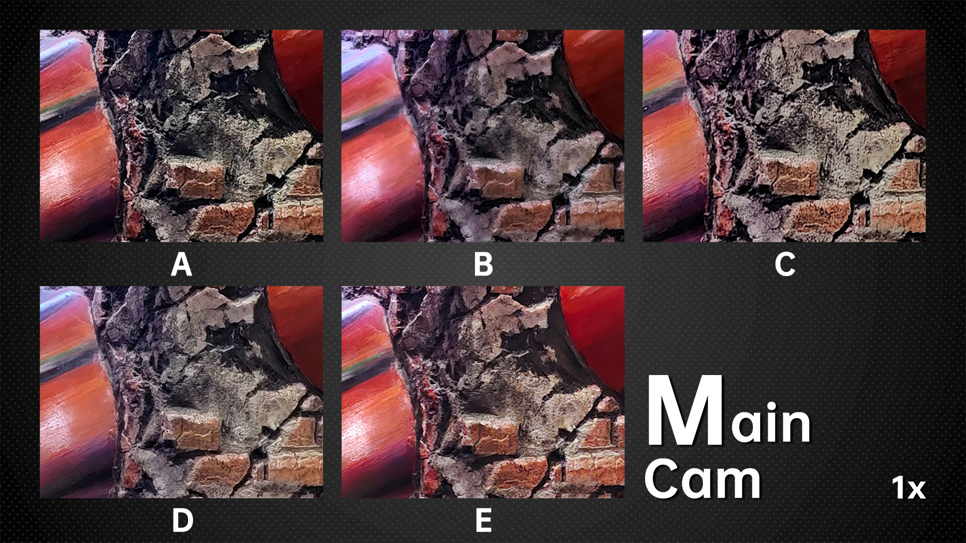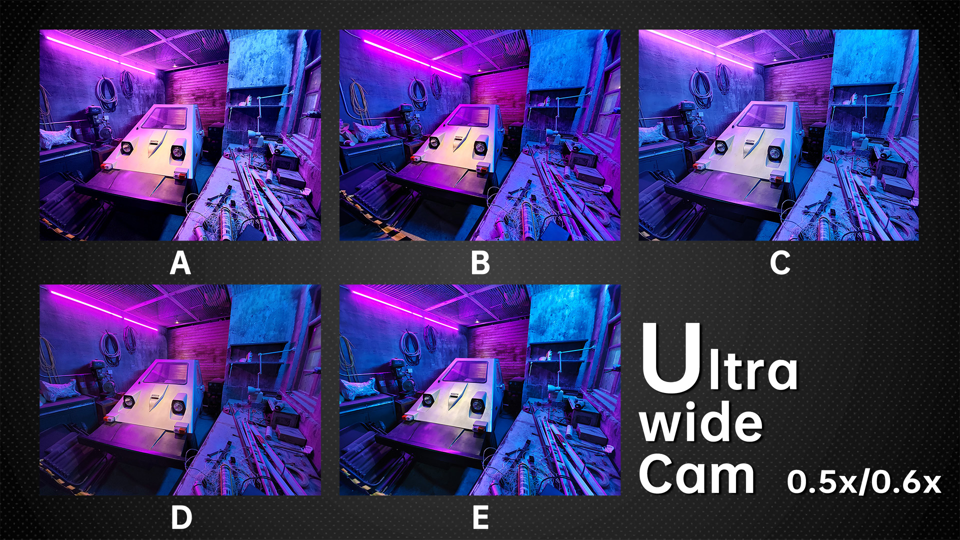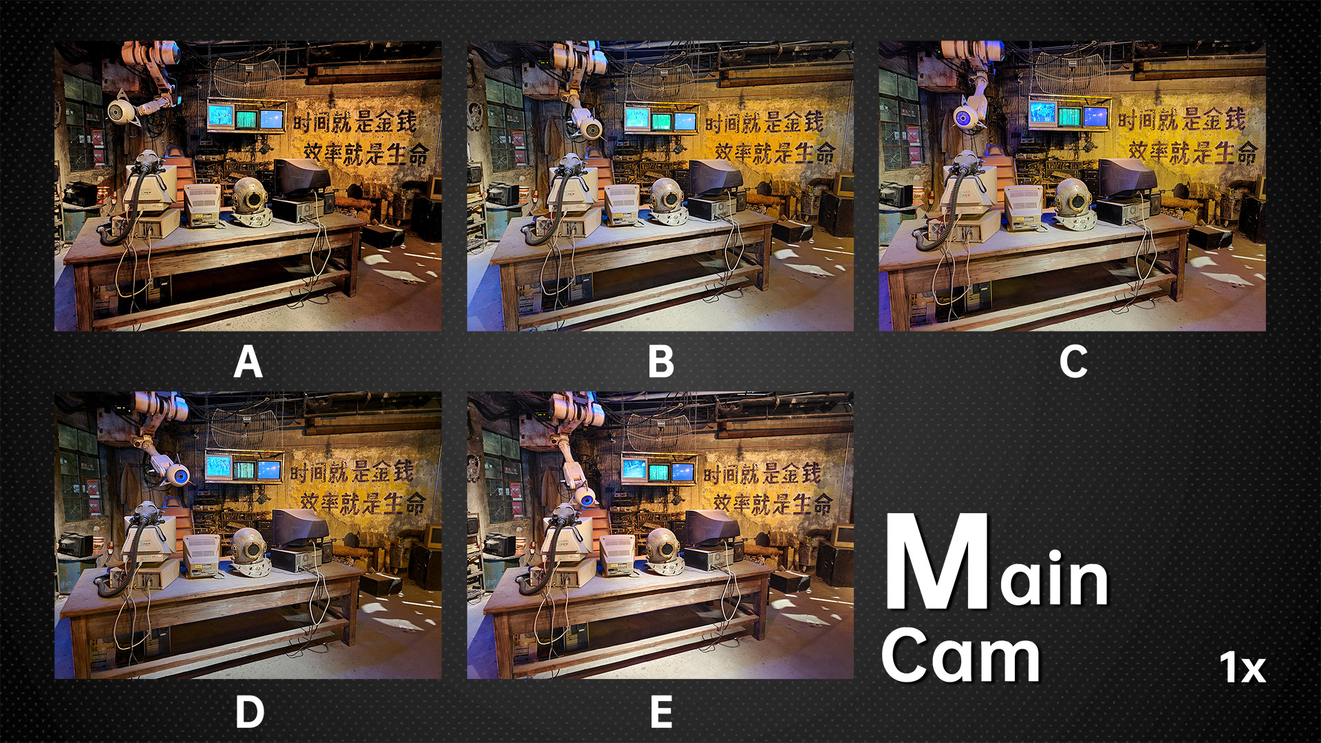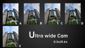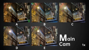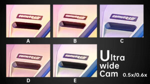 Under dim indoor light, the ultra wide angle cameras with average sensors are tested to the extreme. Look at the words on the car, the sample from B basically can’t be read anymore. In the samples from A and E, we can still read a few letters. While in the samples from D and C we can basically see all the letters. The D‘s ultra wide-angle lens, like its main camera, continues to have the most noise. Others have better noise control.