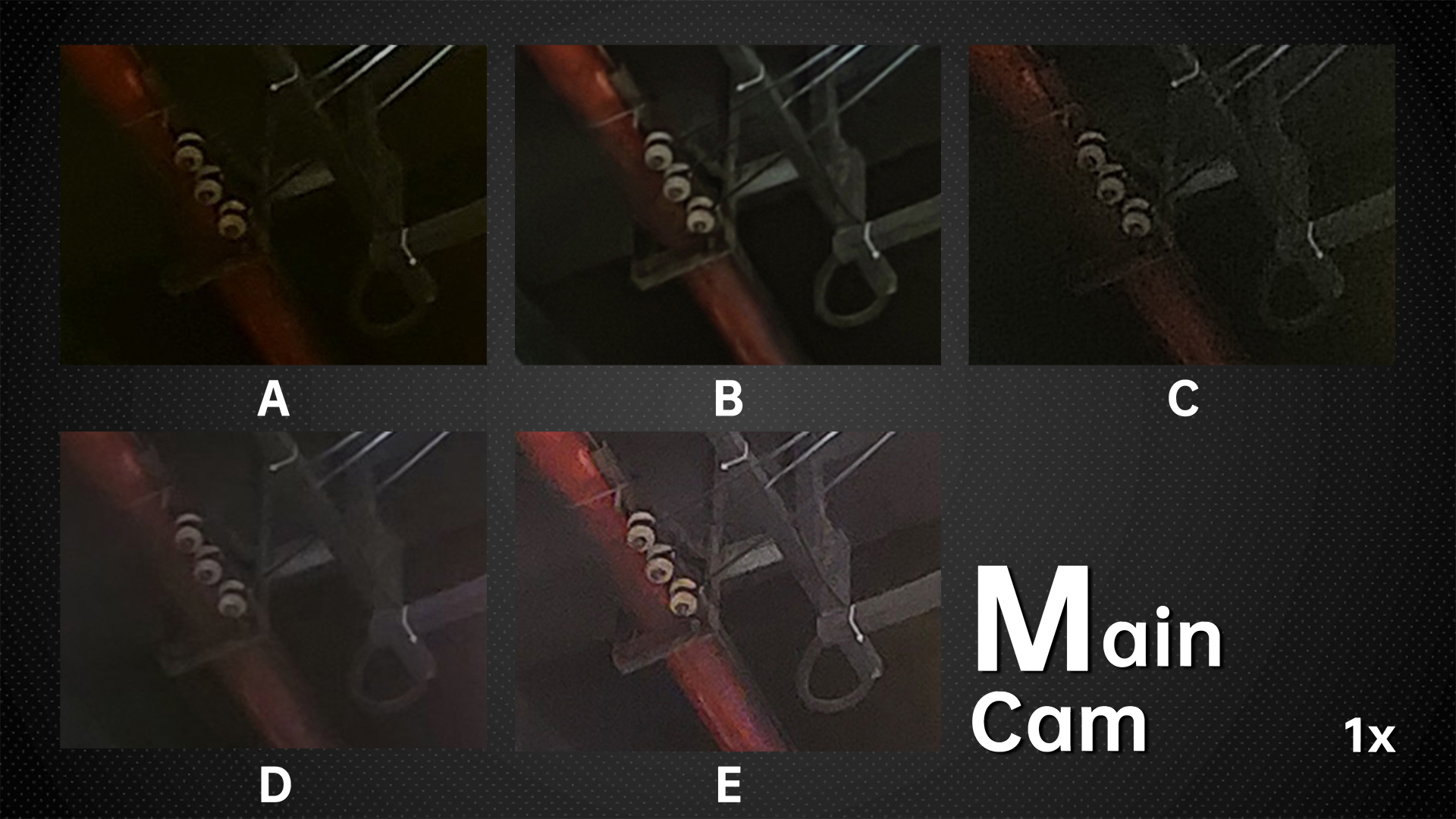 The rest of the phone ranking is basically the same as 5x zoom samples. The gap is even more pronounced in dark indoor environments. B is still unbeatable in terms of dynamic range and noise control, while E also performs well. With night mode on, the dynamic range of A has improved, but the noise has also increased.