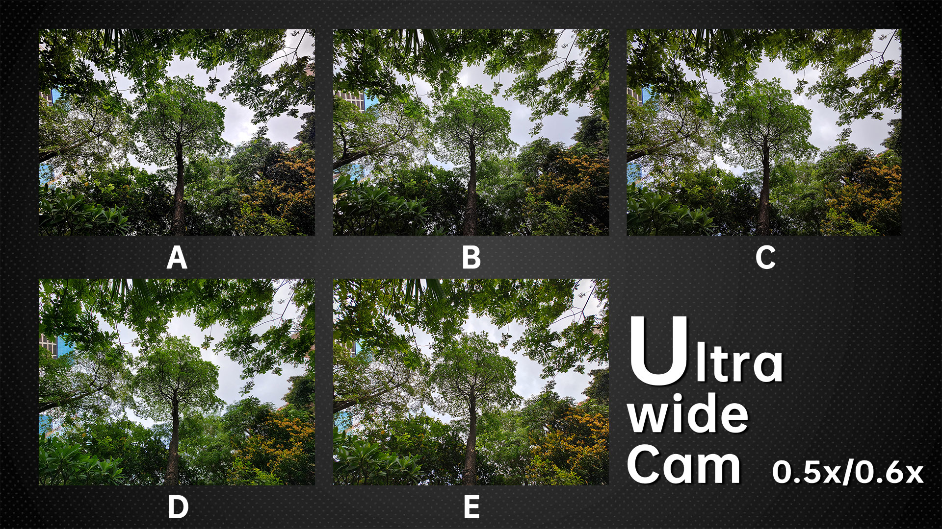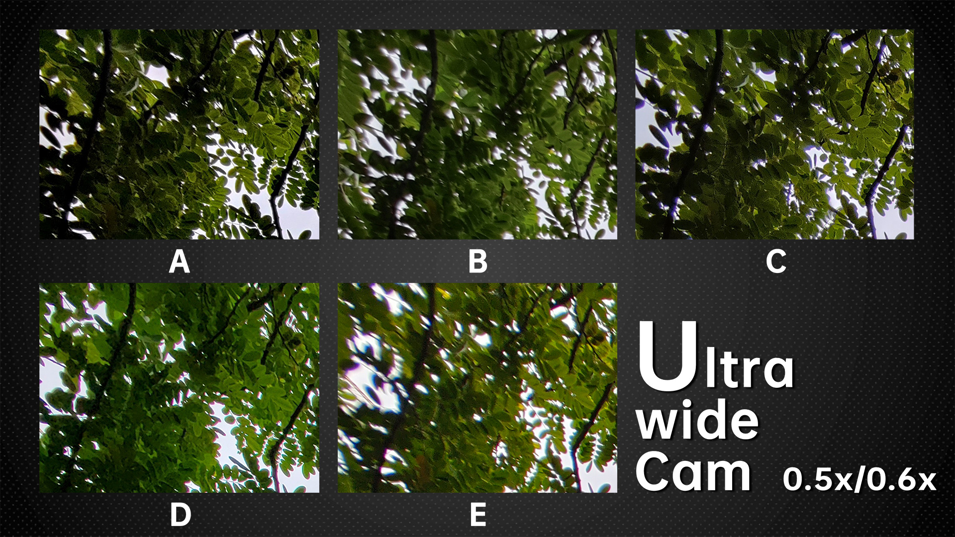 The edge details of an ultra-wide sample has always been one of the most difficult tasks for brands to optimize. The difference is evident in this photo of the tree. A came out on top in this category, both in terms of resolution and control of the purple-fringing issue. B is a little less resolved, but the purple-fringing issue is well controlled. C and D are very good in terms of resolution, but they have a slight purple-fringing issue. The worst is E, which does worse in terms of resolution and purple-fringing issues. However, the noise control of E is good and comparable to that of B. The other three units have average noise control.