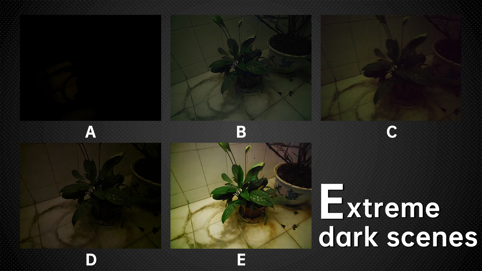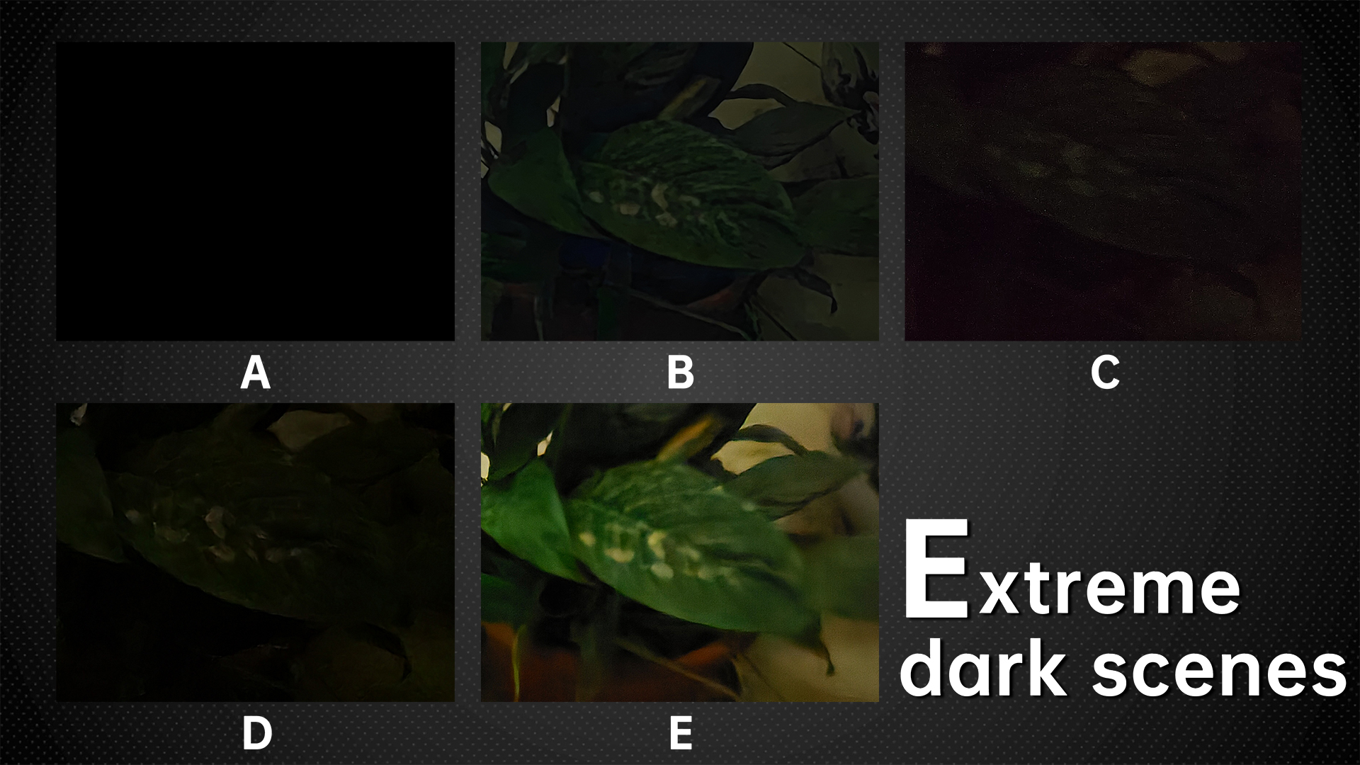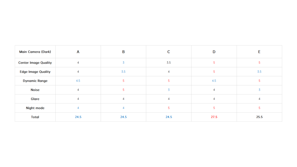 Inevitably, there are times when you need to use your phone to take pictures in almost no light. In such scenarios, we don’t need to consider other factors, and as long as the target object can be photographed, it is considered a success. So this session is a test of the extreme light-sensitive ability of the five phones. Usually, the main camera’s night mode is the most powerful mode for each phone, so we have used it for this test. In terms of exposure alone, E was the brightest. A was so dark that it was impossible to tell what was being photographed. B retained the most details in the picture, followed by D and E. The conclusion of the competition in this segment is very obvious, because the exposure of the picture is more important than the clarity of the shot, so the weight of the score of the picture quality will be smaller in this segment.