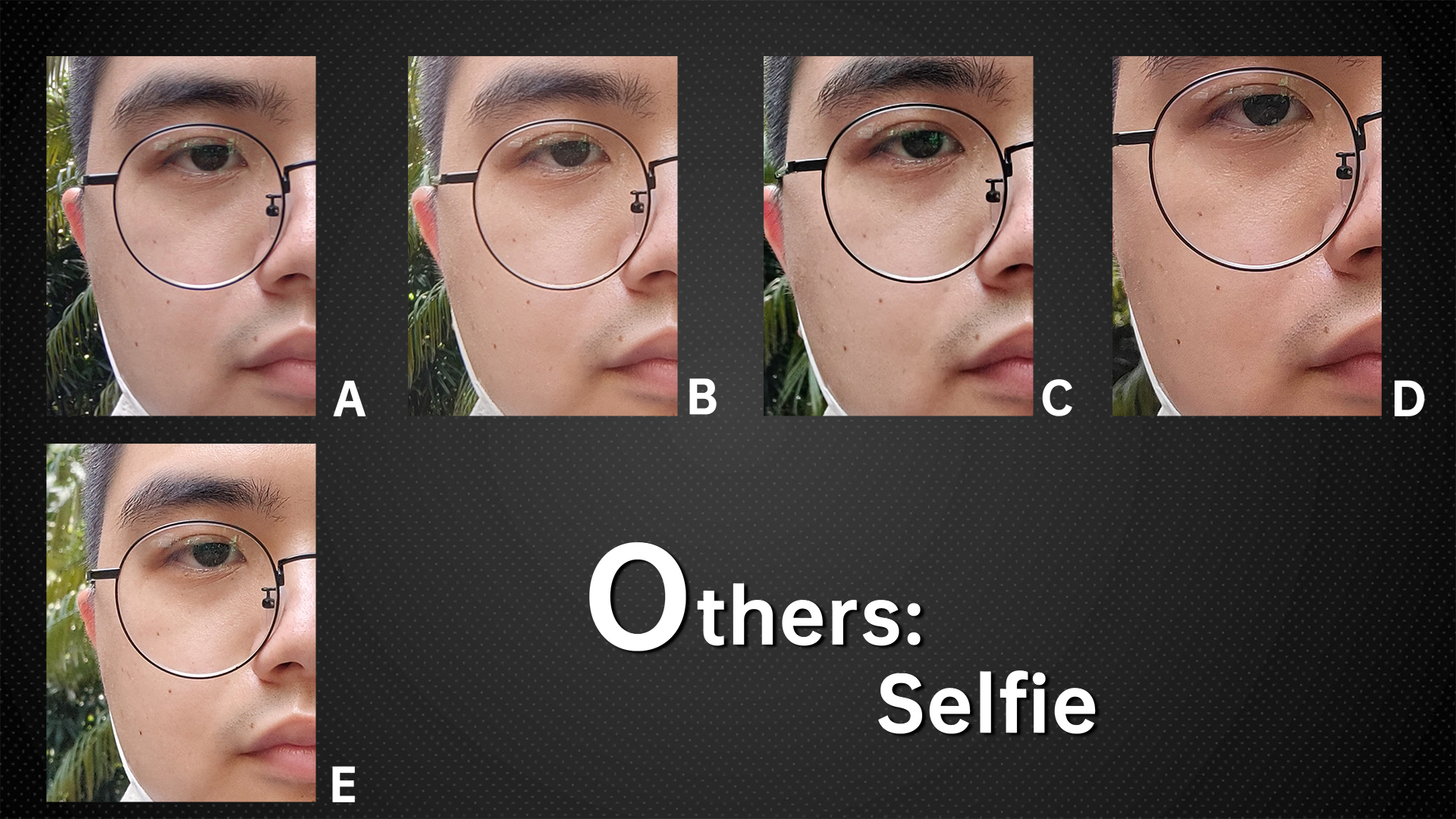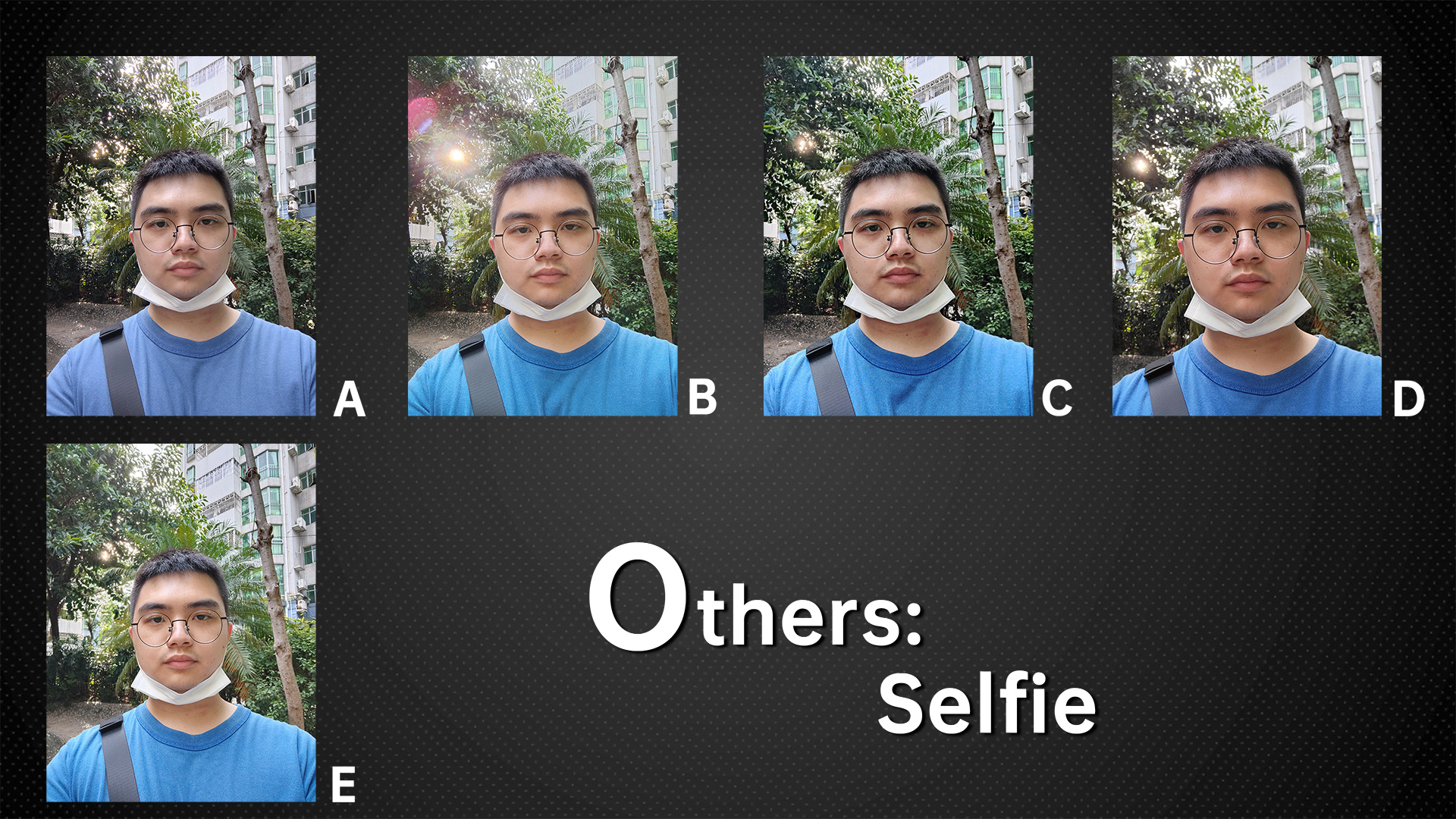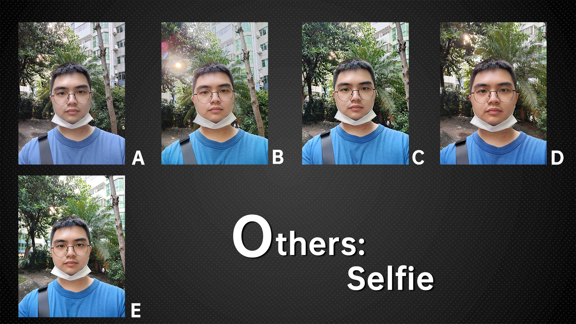 This time we also tested the selfie effect of the front lens. With factory settings, A and C had the strongest beauty effect, and all other phones looked more realistic. After we turn off the beauty on all phones, C and D have the most details.