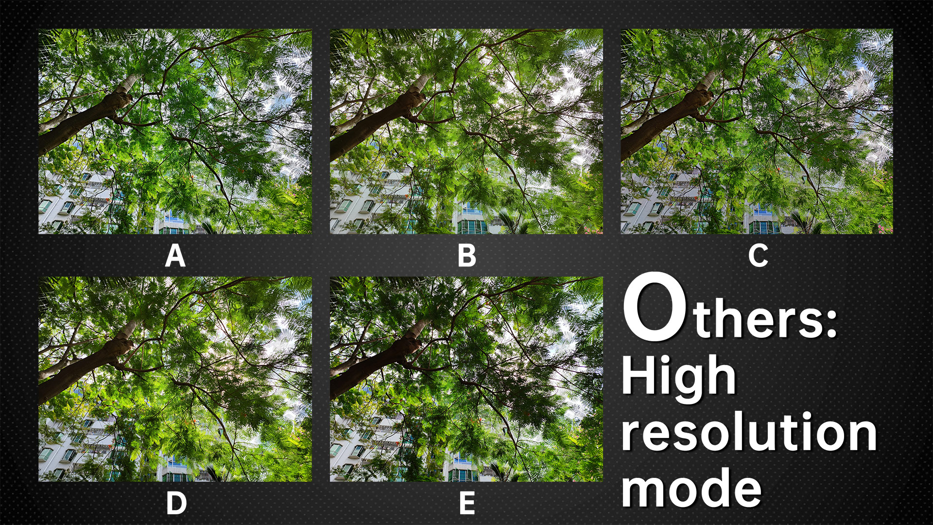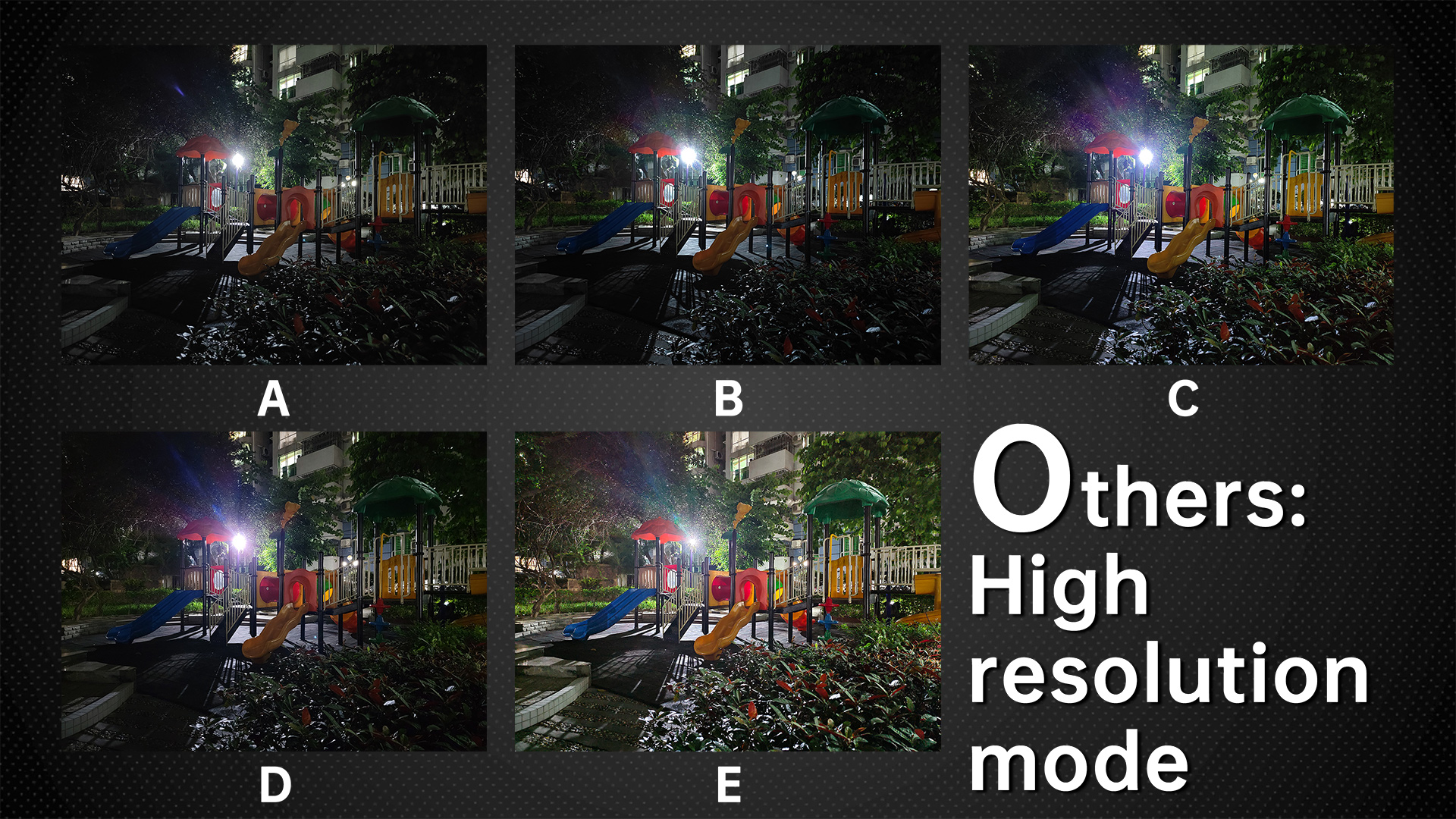 In the high-resolution mode competition, E is not able to activate HDR in this mode, so the dynamic range will be smaller than other phones that can turn on HDR. This can be easily seen from the exposure of the tree trunk. In a different scene, in a light and not backlit scene, the best resolution is D and B, and the worst is A. But in the same scene at night, basically, every phone is close in performance regardless of the pixel level. So It seems that the high-resolution mode should be used in the daytime.