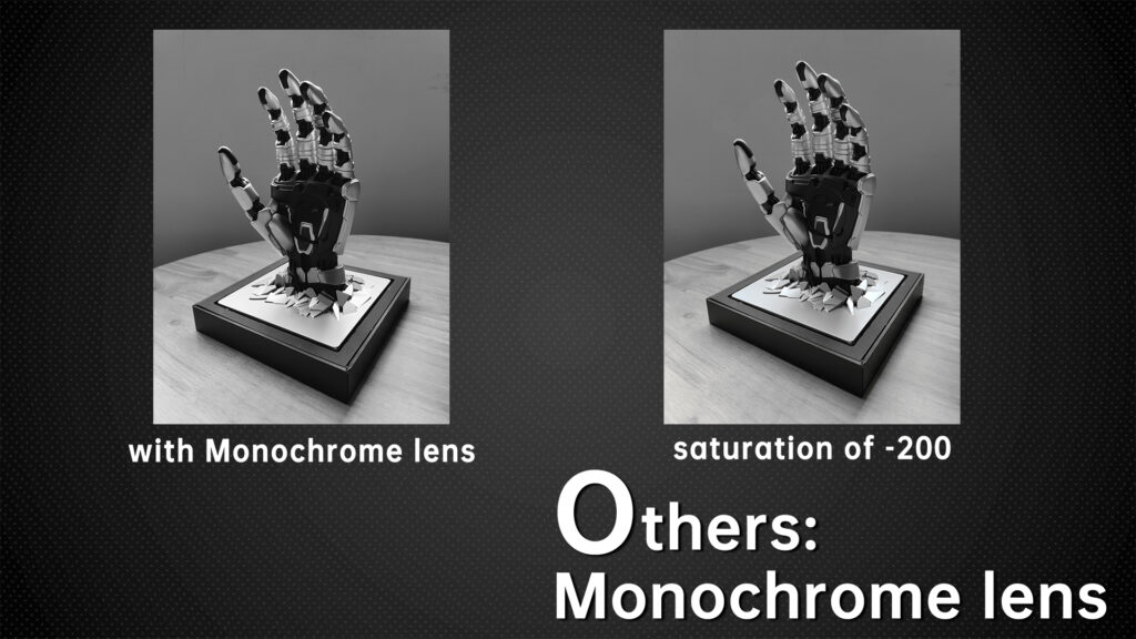 And C has a Monochrome lens, which allows you to take black and white photos. Here is a photo with a Monochrome lens and a direct shot with a saturation of -200, can you see the difference between them?