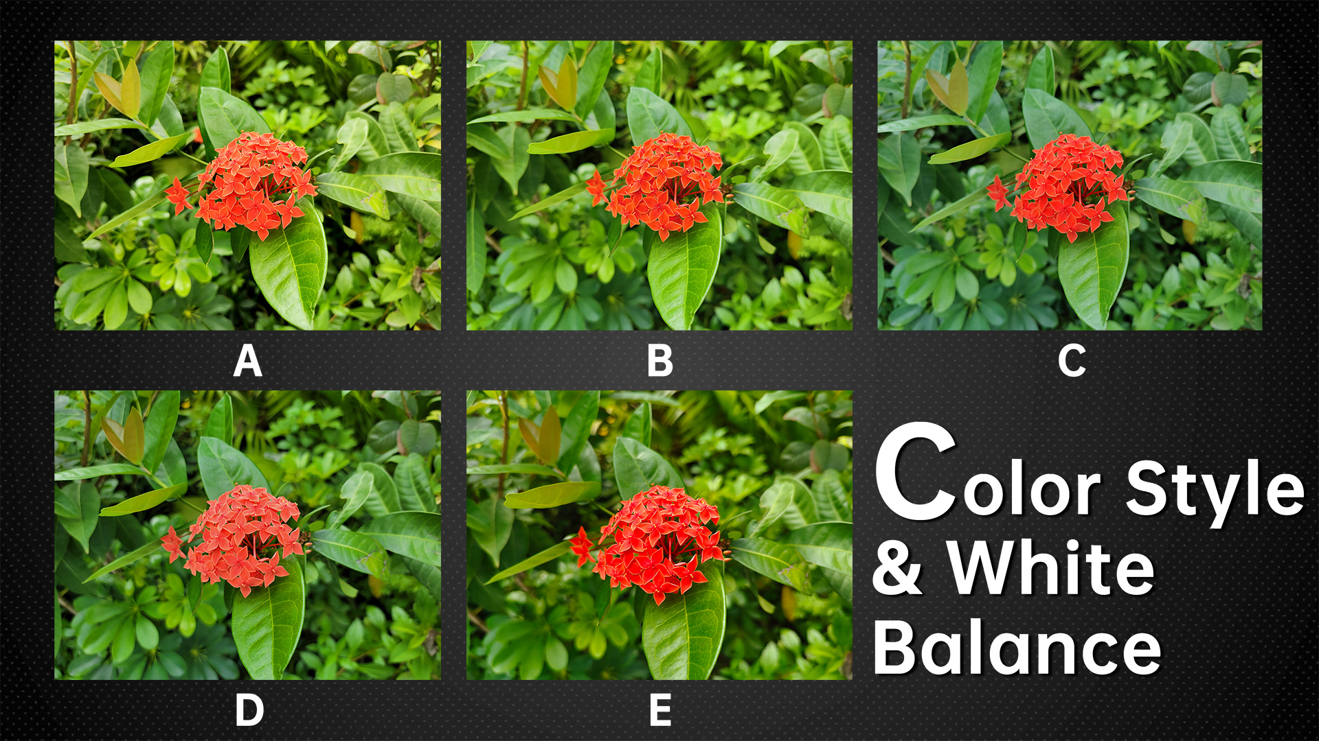 Just as different brands of cameras have different color science, the five phone brands have different understanding of what colors makes the samples better. E and A usually have the highest saturation. C’s saturation is turned up while brightness is turned down to make colors more intense, especially reds and greens. D and B also increase saturation, although the strength is not great and there is little difference from what you can see with the naked eye. Color style preferences vary from person to person and are not evaluated here, but whether the white balance is accurate can be measured uniformly. So take a look at the white balance uniformity of each phone’s main camera.