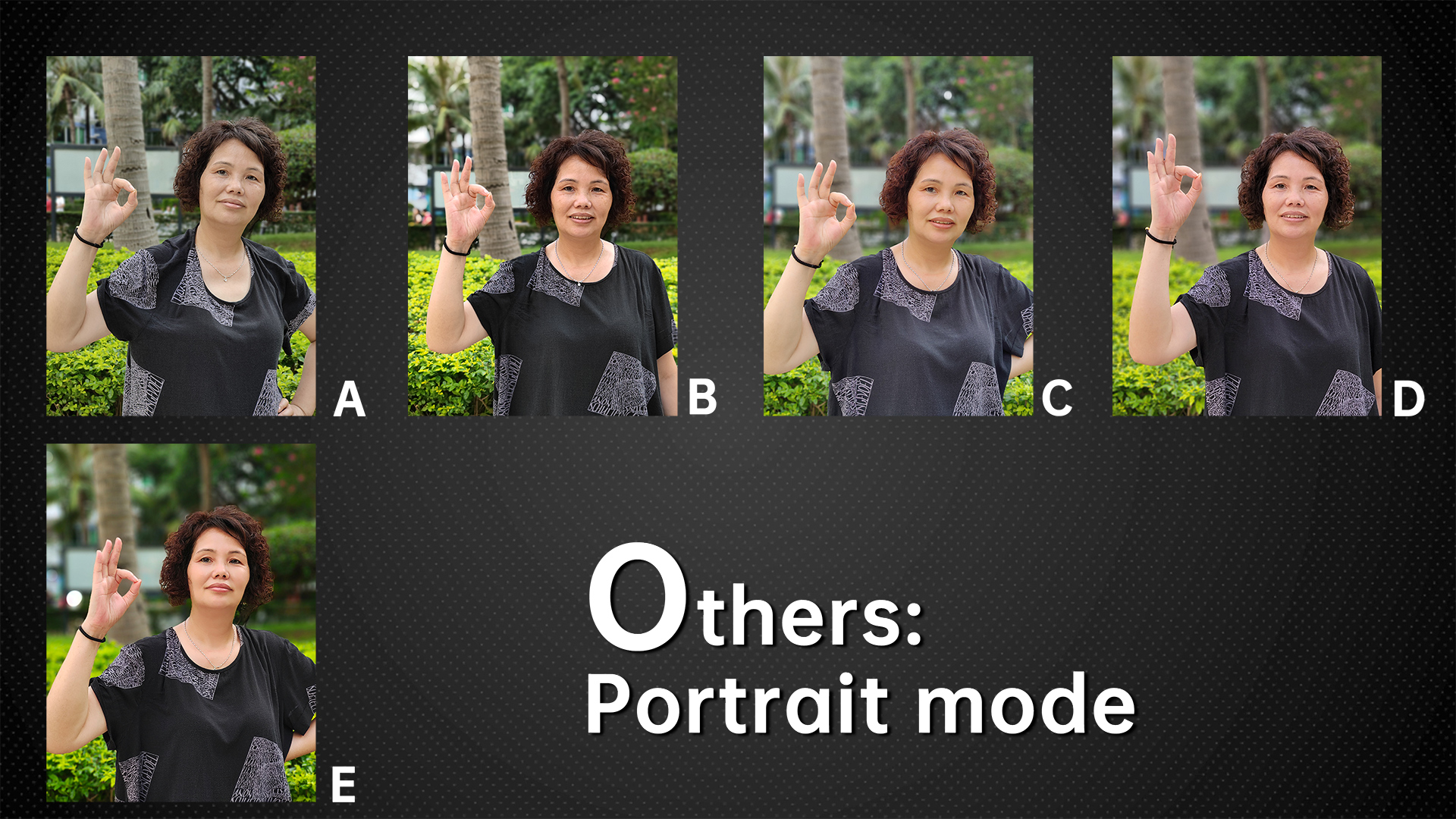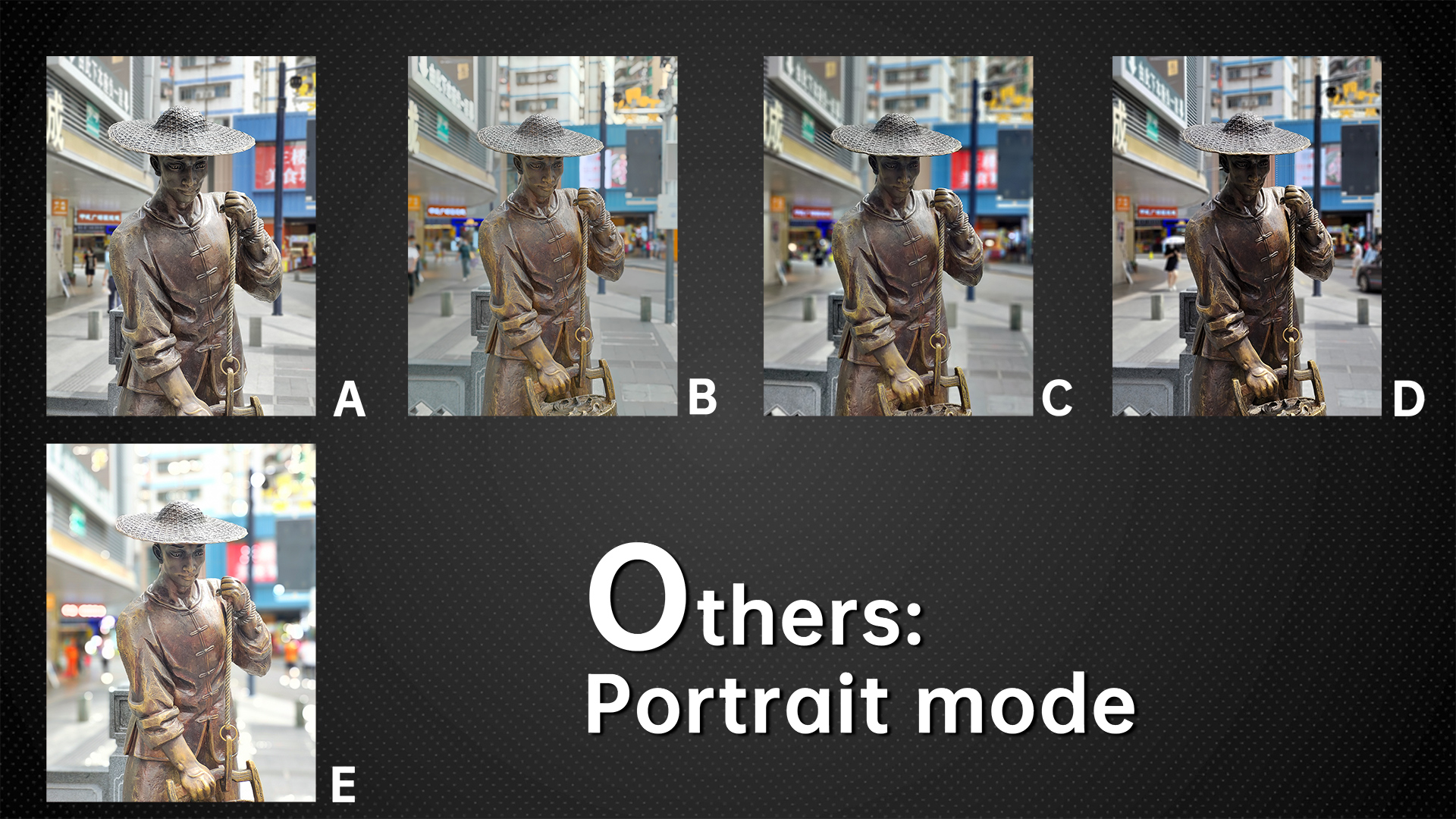Portrait mode is also a frequently used mode. This mode tests the accuracy of its face exposure strategy, beauty algorithm and portrait keying. This bronze statue wearing a hat has very heavy shadows on its face, but B does a good job of balancing the background with the exposure of the face. E has a great exposure for the face and automatically adds some light spots to the background. D has a dark face.