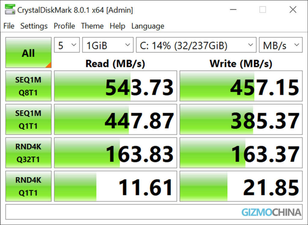 We also tested the SSD storage performance. The result shows that the laptop is adequate for common office use. And if you are not satisfied with the SSD, the laptop allows you to easily replace it by yourself.