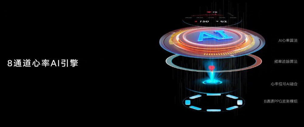 The highlight of the Honor Watch GS 3 is its 8-channel PPG sensor which also uses an AI algorithm and AI Engine to accurately measure heart rate. As shown in the image below, the heart rate module includes an 8-channel PPG module, a heart rate AI Engine, a frequency tracking algorithm, and an AI heart rate algorithm. Honor says they all work together to capture your heart rate data faster and more accurately.