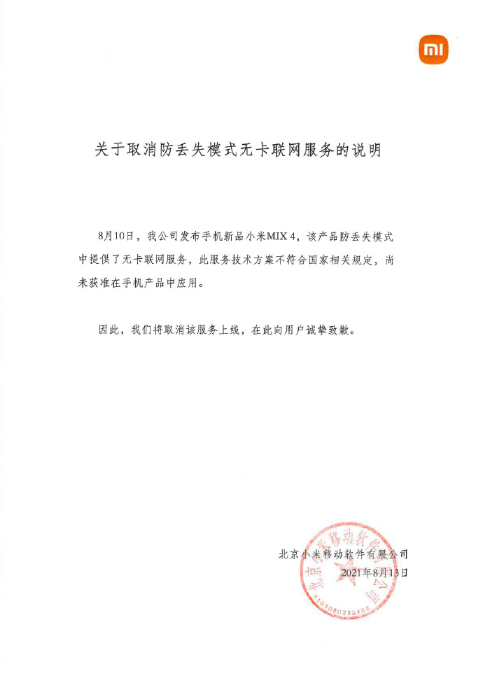 The Mi Mix 4 has a built-in virtual SIM card that can help locate the device even if it has no SIM card. However, the feature had to be removed due to non-compliance with national regulations (China). According to the official statement posted by Xiaomi on Weibo, the technology hasn’t been approved for application in mobile phone products. Further, the company has also apologized to its users for removing the anti-lost mode.