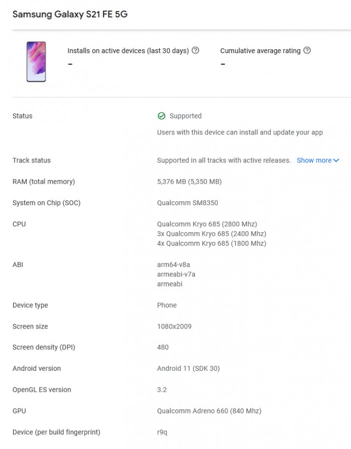 The Google Play Console listing for the Galaxy S21 FE which was spotted by MyFixGuide, confirms some of the key specifications of the flagship model. The listing shows that the Galaxy S21 FE will be powered by a Qualcomm Snapdragon 888 processor with Adreno 660 GPU, and a frequency of 840MHz. The processor is paired with 6GB of RAM. There are rumors of an Exynos 2100 version but we cannot confirm if that will become a reality.