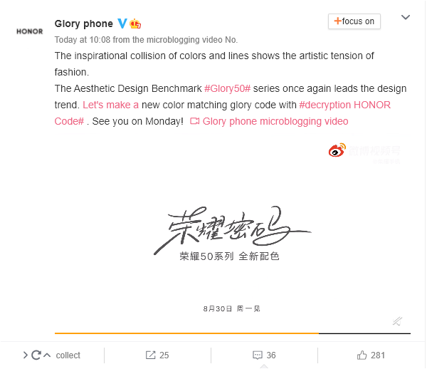The Huawei spin-off company shared a promotional video on Weibo pointing to the unveiling of a new color option for the Honor 50 series on Monday, August 30, 2021. The teaser suggests that the new color scheme will reflect the artistic outline of the present color options and will be fashion-themed.