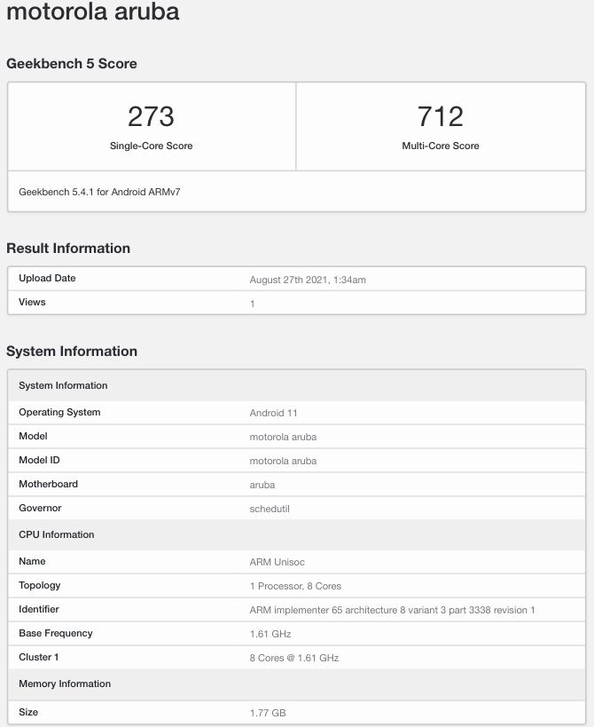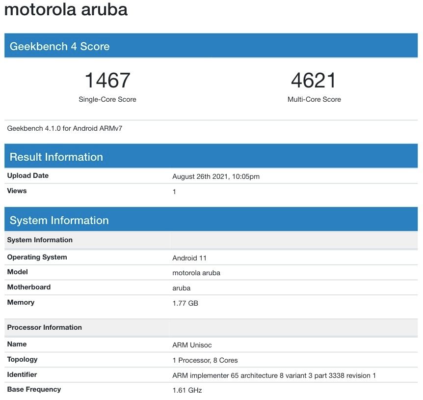 It is known that the upcoming Motorola Moto E20 is internally known as Aruba. Today, the Motorola Aruba appeared on Geekbench 4 and Geekbench 5 platforms with key specifications. Both listings show that the handset has a Unisoc chip that works at 1.6GHz, 2 GB of RAM, and Android 11 OS.