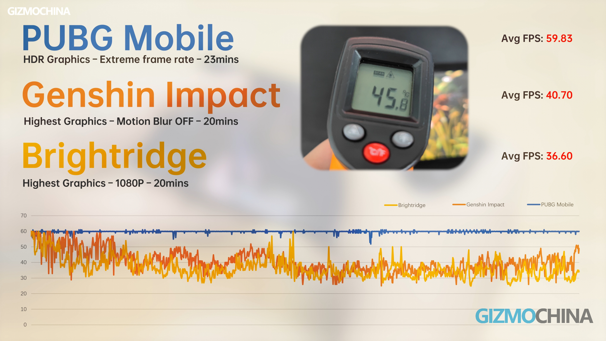 The Benchmark performance is conservative, but the gaming performance is not bad. PUBG basically runs at full 60fps throughout. While Genshin Impact does not run at full 60 fps, the frame rate curve fluctuates less and there is no frame lock. The average frame rate of 40.7FPS will still ensure a good gaming experience. Brightridge also performs similarly and has good temperature control. If you’re not looking for extreme frame rates, this phone is still pretty good for gaming.