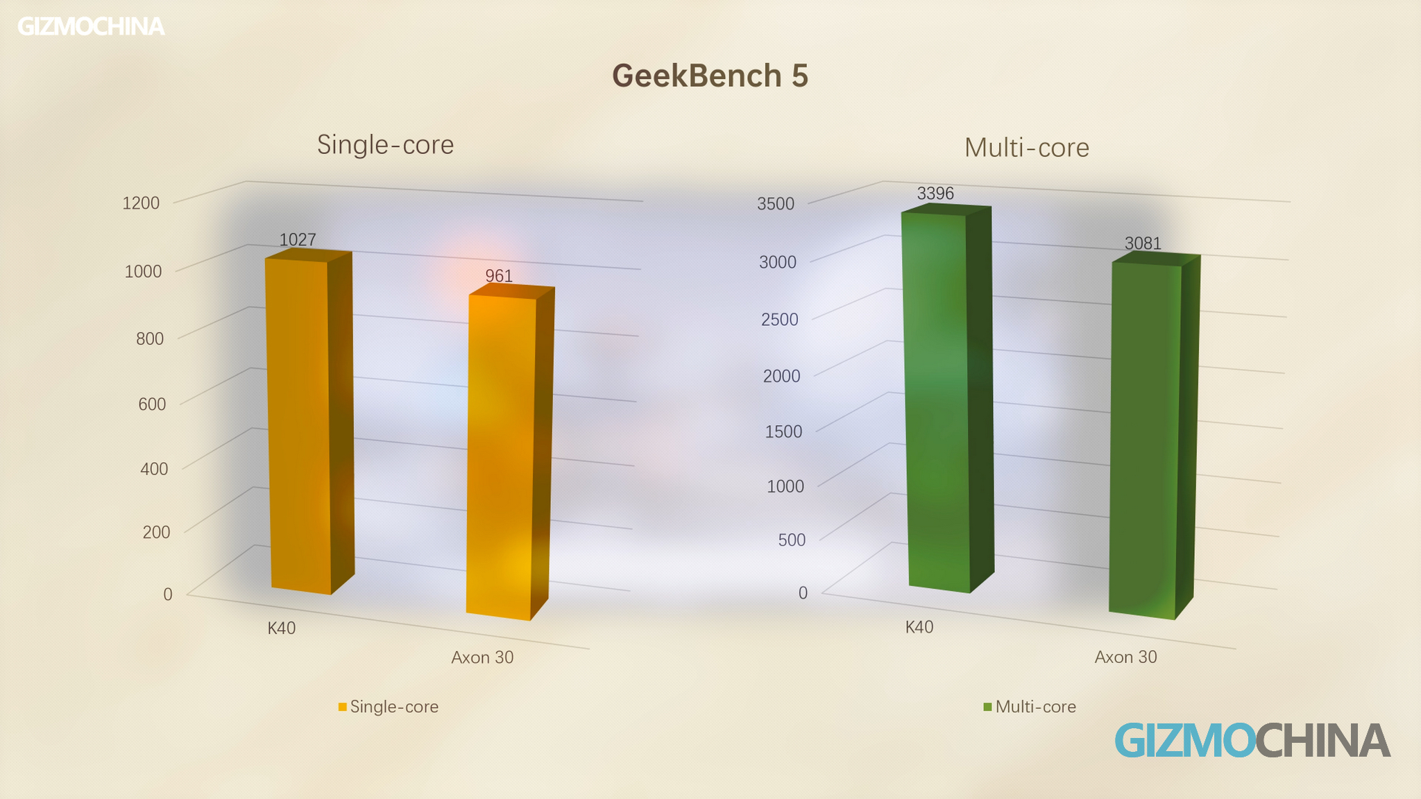 The Axon 30 features the Snapdragon 870 as its SOC, which we all have come to love. In Antutu Benchmark it scores 688,114, while in 3D Mark it gets a score of 4223, and in Geekbench 961 in single-core, and 3081 points in multi-core.