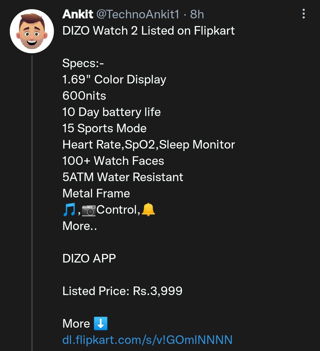 That being said, the Dizo Watch 2 was listed on Flipkart but it turned out to be a mistake as the page has been pulled down. The listing reveals all there is to know about the smartwatch including the design, key specs, and even the price. However, Twitter tipster @TechnoAnkit1 was able to preserve the details before they were pulled off the website.