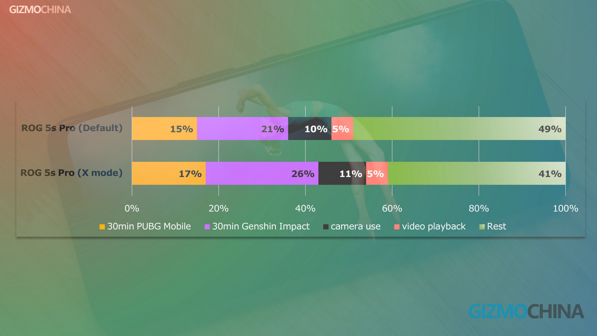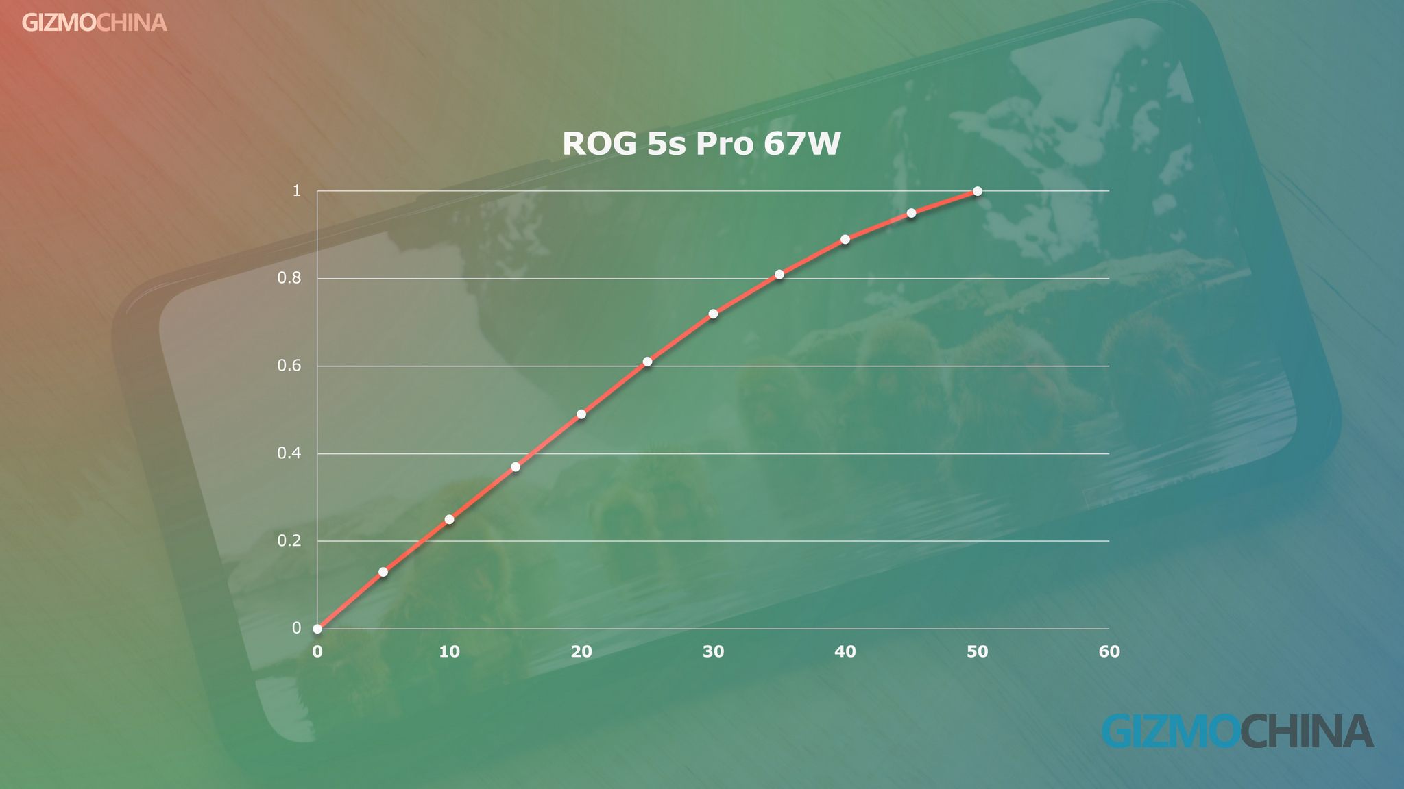 As for battery and charging, it’s obvious that ROG tried to support your long gaming sessions with a 6000mAh battery. However, in our power-consumption test, the 6000mAh battery didn’t show significant advantage in gaming battery life. Especially under X mode, the power dropped quickly with heavy games. And with the included 67W charger, it took around 50mins to finish our charging test.