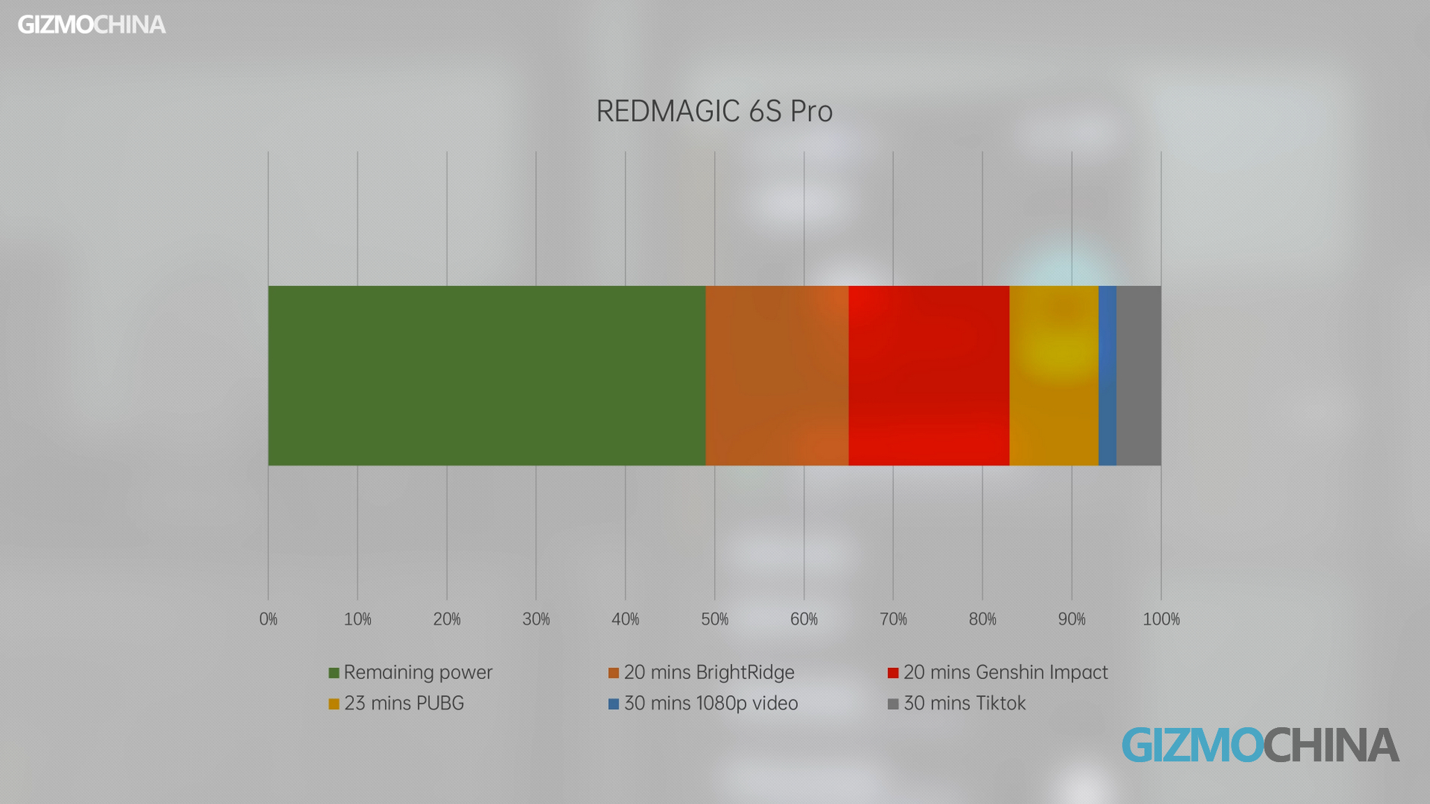 5 minutes tops up the battery to 11%, another half an hour to 62%, and 55 minutes to full charge. Although the 6S Pro has a large 5050mAh battery, it consumes more power in the gaming section because of its high performance. 20 minutes of Genshin Impact and Brightridge consume 18% and 16% respectively, 10% for PUBG. Daily applications do not consume a lot of power as 1080P online video only consumes 2% and while Tiktok around 5%.