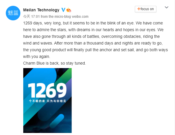 In a Weibo post, Meizu Charm Blue officially announced the return of the brand after being off-air for 1269 days. Going by this, it means the brand halted product releases in March 2018, about four years after the product line opened. Meizu introduced the Charm Blue product line in December 2014.