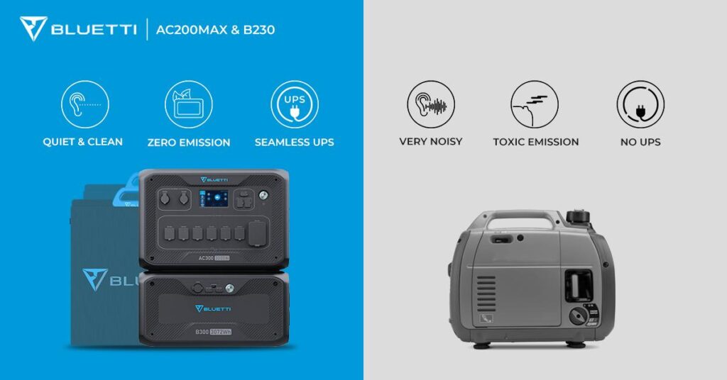 Noise pollution and air pollution apart are major concerns while using Gas-powered generators. Moreover, these weigh quite a lot if we compare it with Bluetti AC300 which weighs 44 pounds and the B300 battery having a 74lbs weight.