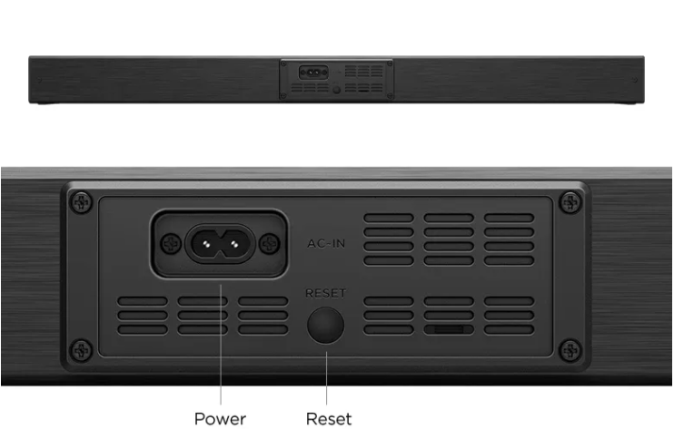 The Soundbar aims to promote a clutter-free environment while also enhancing the audio experience of the entertainment center. Its wireless capability means that there is no need for HDMI or audio ports. The only cable needed for the setup of the Soundbar is the power cable. The Roku TV Wireless Soundbar uses Wi-Fi 802.11ac, as well as the existing Roku TV remote. With the remote, the Soundbar can be seamlessly paired with the Roku TV using the setup menu on the TV. A reset button is at the back of the Roku TV Wireless Soundbar.