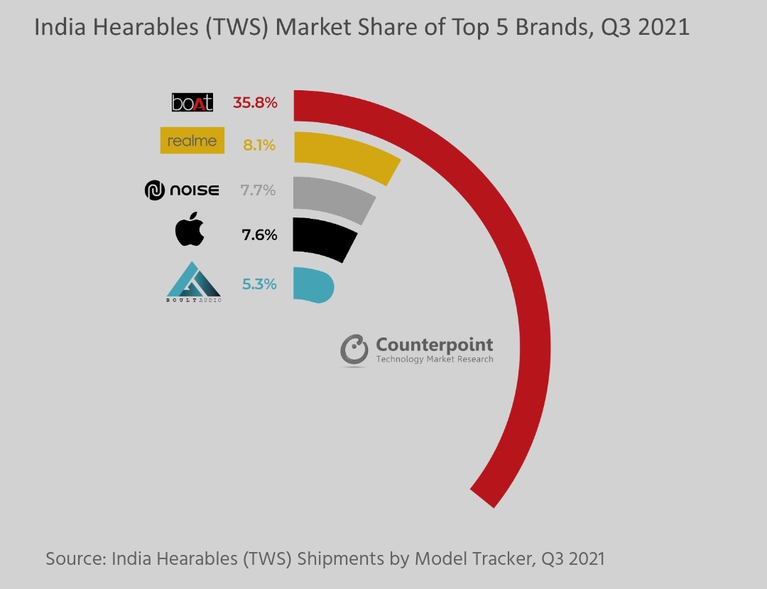The Counterpoint research showed that boAt (35.8%), realme (8.1%), Noise (7.7%), Apple (7.6%), and Boult Audio (5.3%) are the top five brands in the market based on their shipment volumes. Several other budding brands are waiting in the wings to ride on the Indian market.