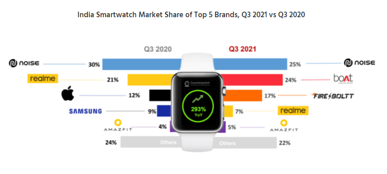 Counterpoint Technology Market Research is a global research firm with a niche in the tech, media, and telecom industries. It has continued to churn highly reliable numbers across several markets. The Indian smartwatch market recorded an increase of 159% in shipments in the third quarter. The numbers also indicated that year-on-year, the growth was 293%. The surge in shipments was driven mainly by the top three brands in the market: Noise, boAt, and Fire-Boltt, accounting for 66% of the shipments. Noise grew by 141% from Q2, while boAt grew by 132%, and Fire-Boltt had a massive 394% growth from Q2. The market share of the trio was 25%, 24%, and 17% respectively.